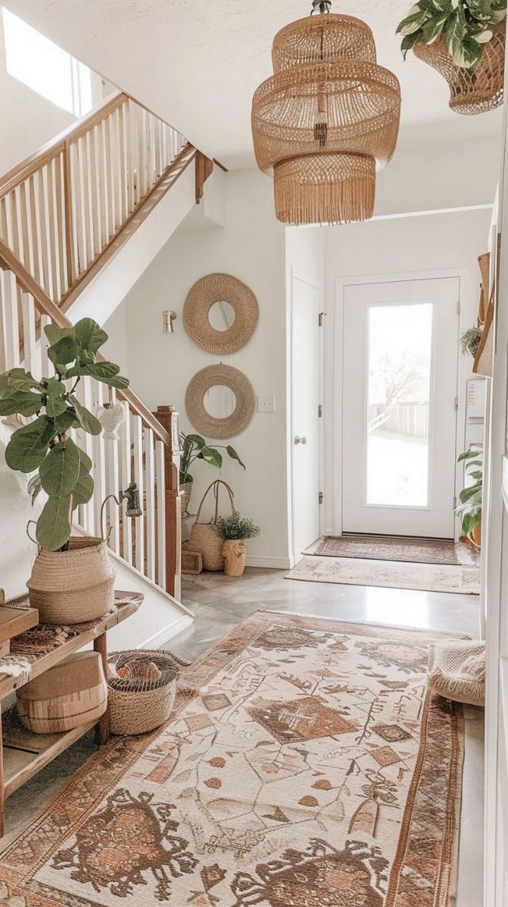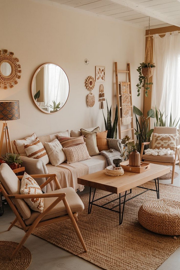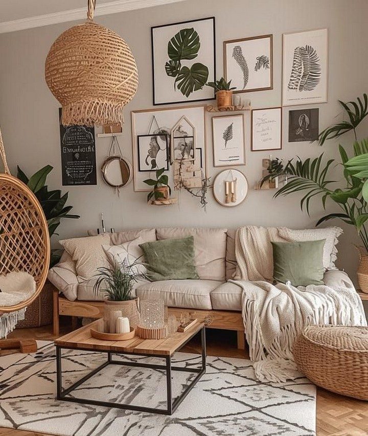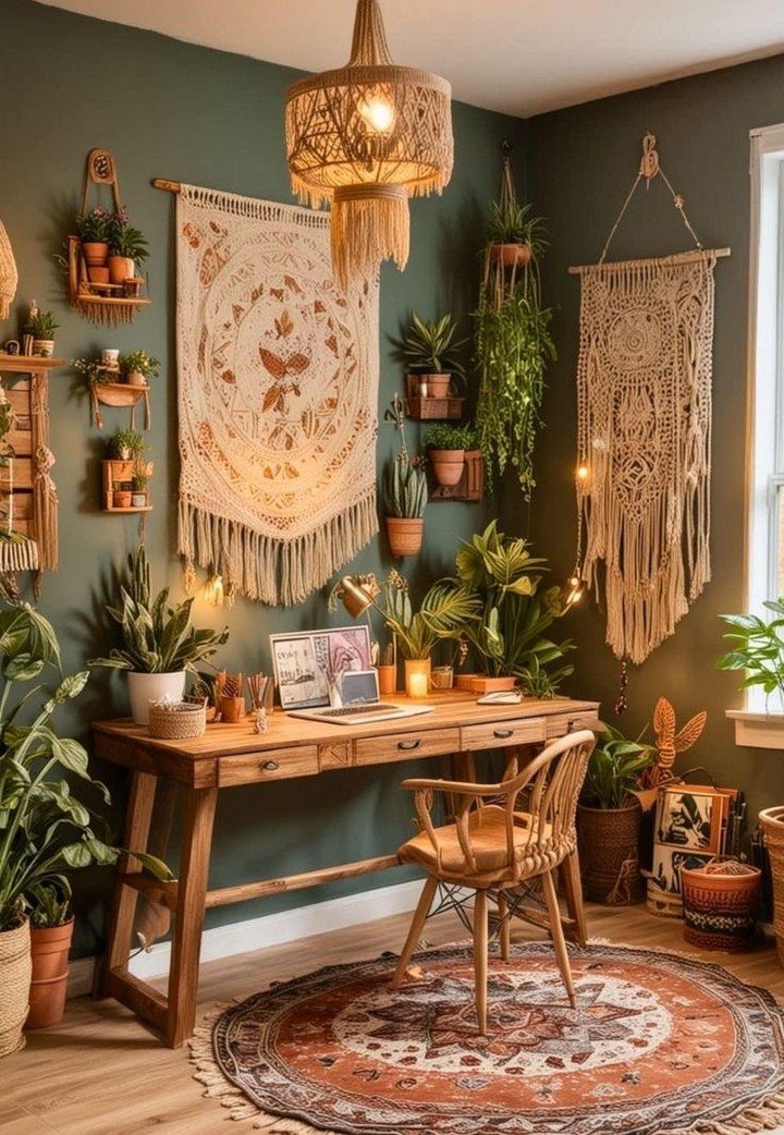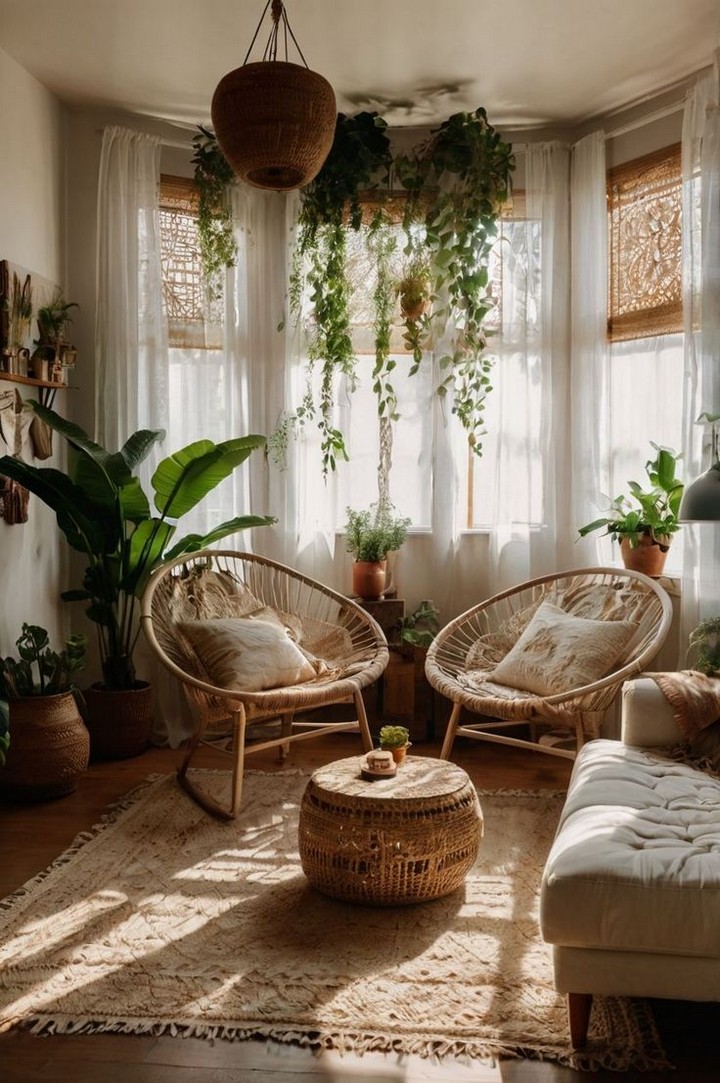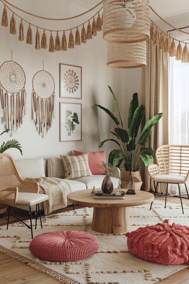 Incorporate hanging plants like pothos, spider plants, or string of pearls to add lush greenery without consuming valuable floor space. Use macramé plant hangers (easily DIY-able) to suspend them from ceiling hooks near windows. Plants introduce life and organic shapes essential to boho design while improving air quality.