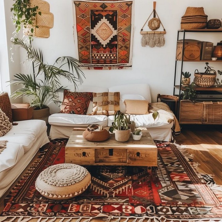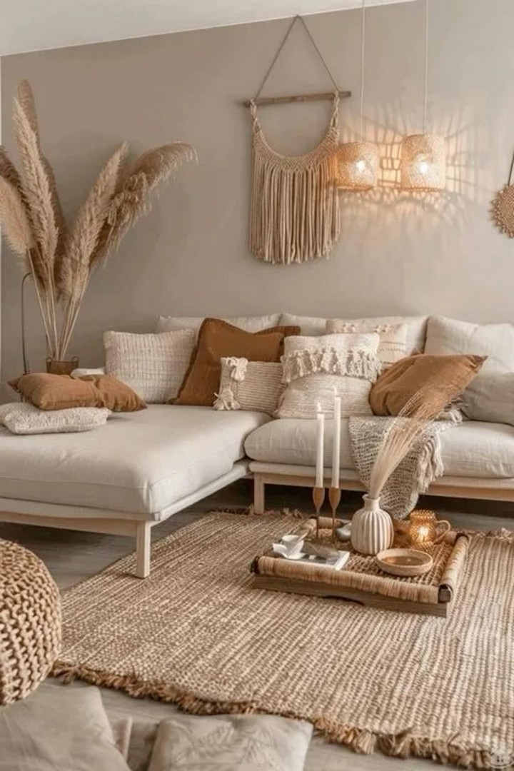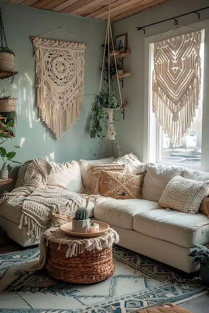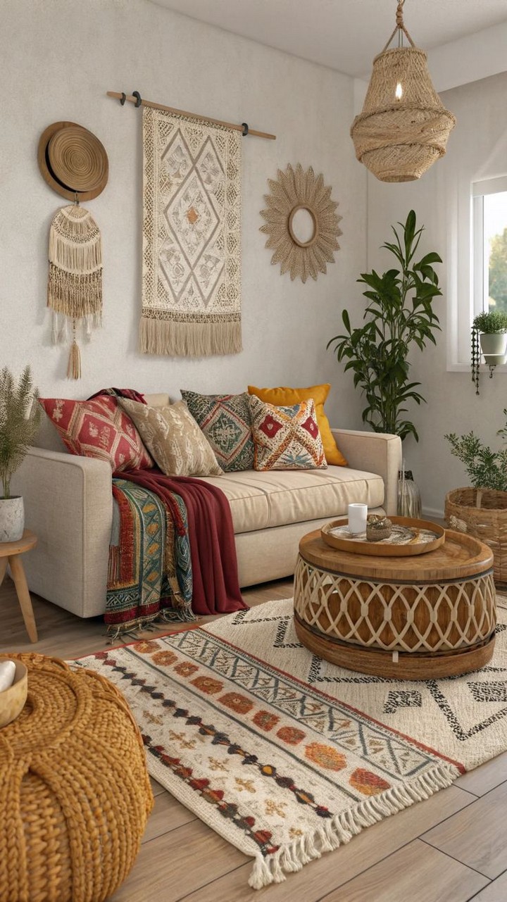 A large macramé wall hanging serves as affordable artwork while adding texture and bohemian flair. Look for budget options online or try making your own with inexpensive cotton cord following YouTube tutorials. Position it above your sofa or bed as a focal point that instantly communicates the boho aesthetic.