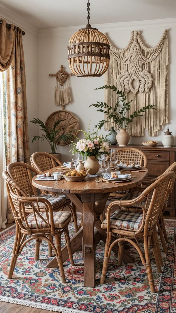 Incorporate natural textures into dining areas with jute, bamboo, or rattan placemats paired with a simple linen or cotton table runner. These affordable table accessories (typically under $5 each for placemats) add warmth and tactile interest to dining experiences while reinforcing the natural material palette central to boho design.