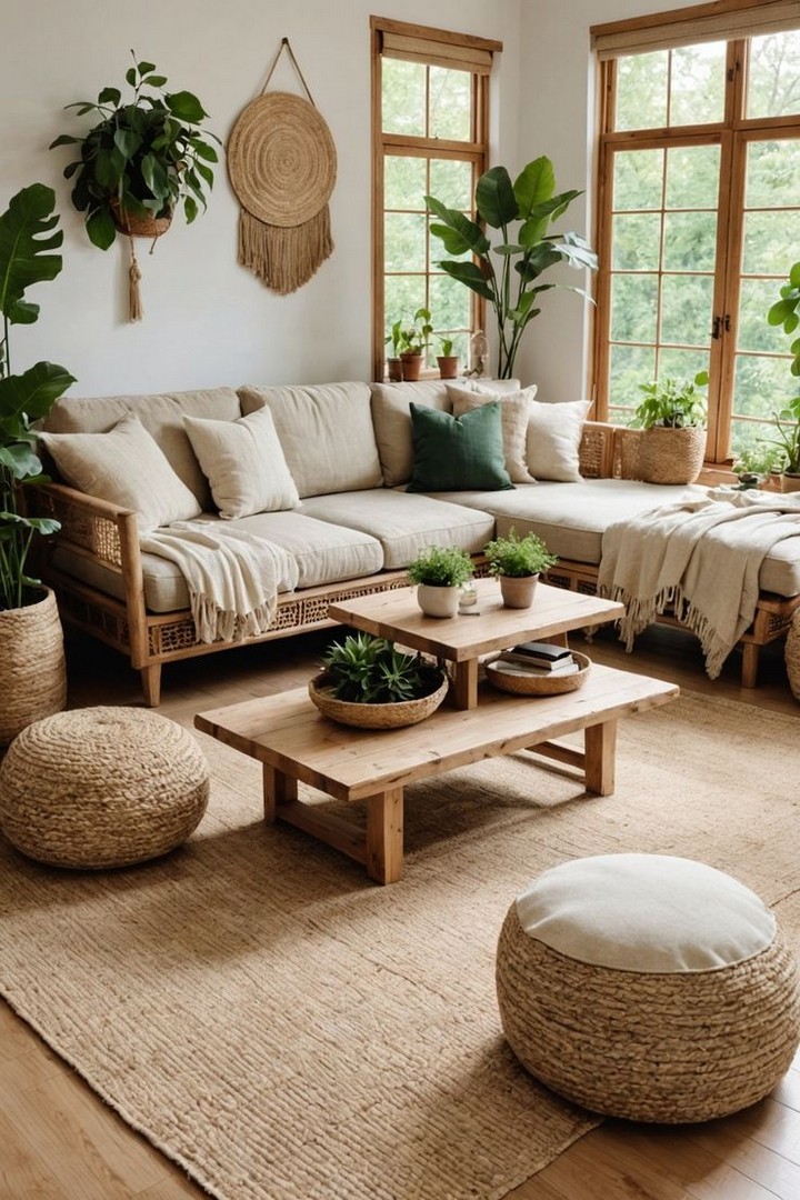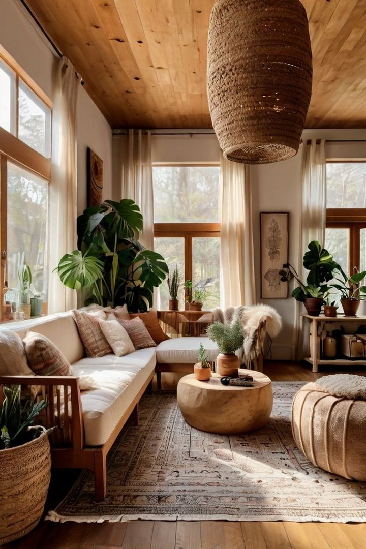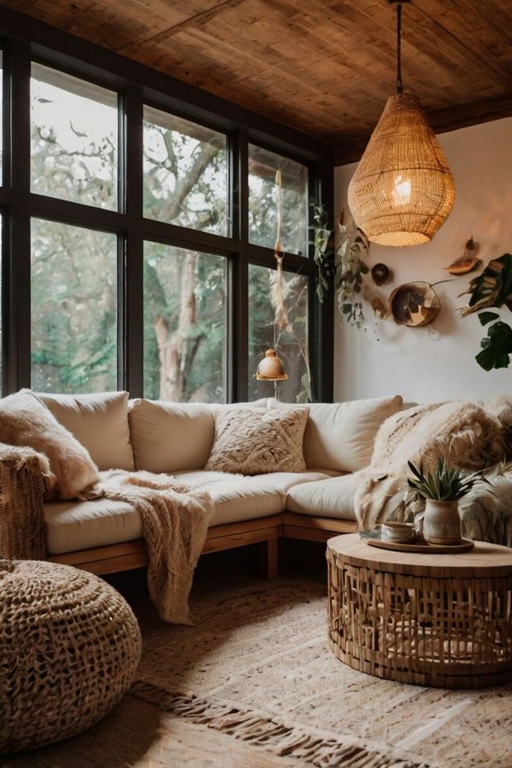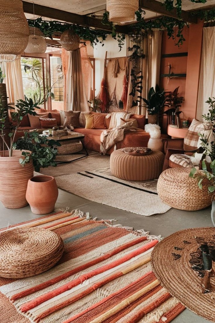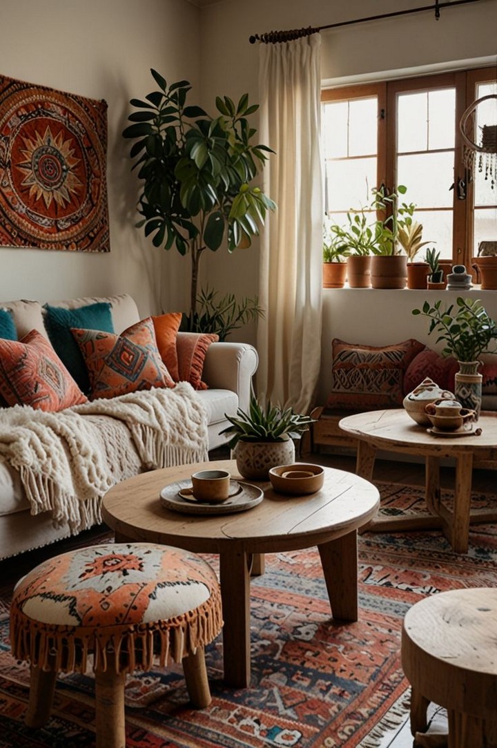 Floor cushions, low coffee tables, and furniture with clean lines closer to the ground create the relaxed, casual atmosphere that defines boho style.