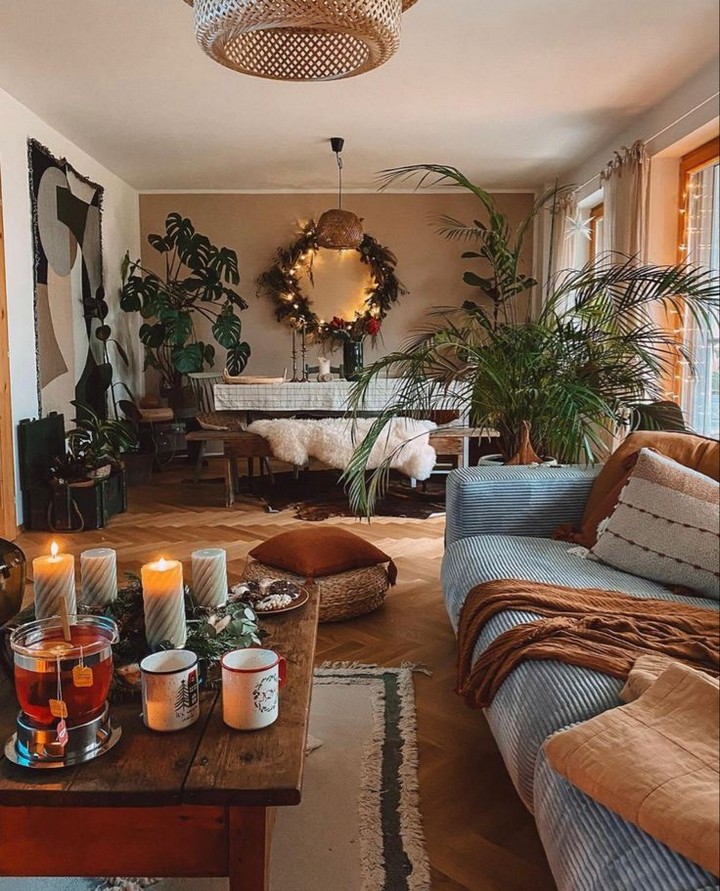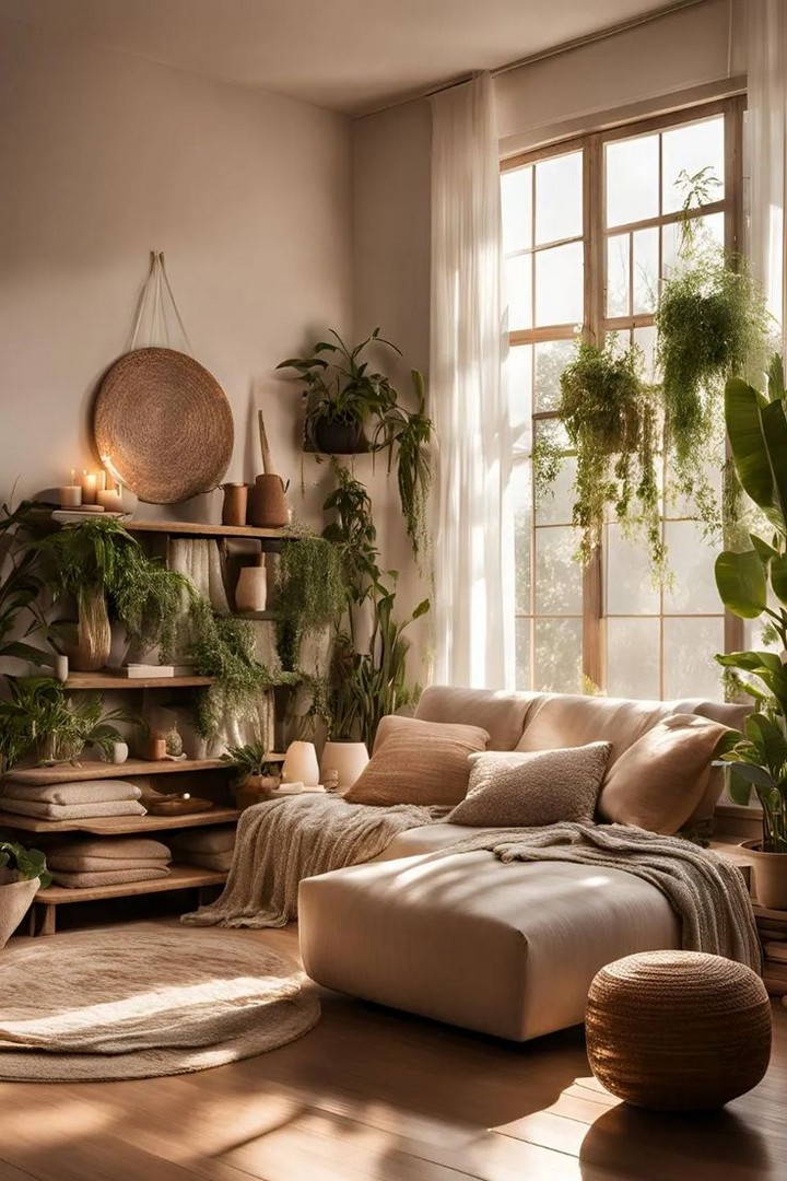 These natural light sources add a warm, amber glow while contributing to the earthy, wellness-focused aspects of boho design.