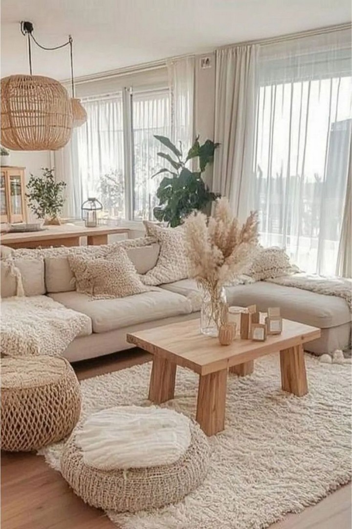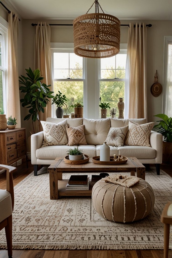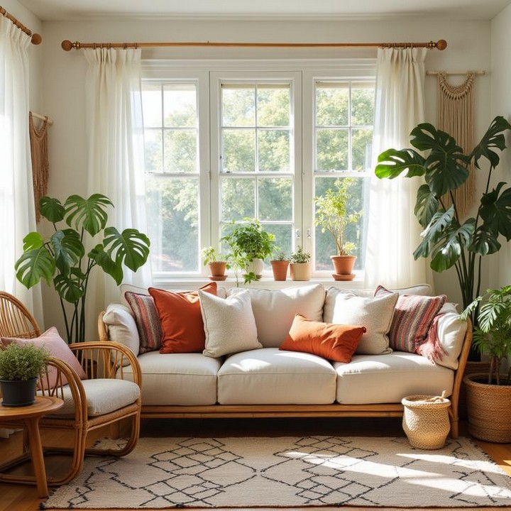 This soft color combination brings a romantic, ethereal quality to your boho living room while maintaining the natural, organic feel essential to the style.