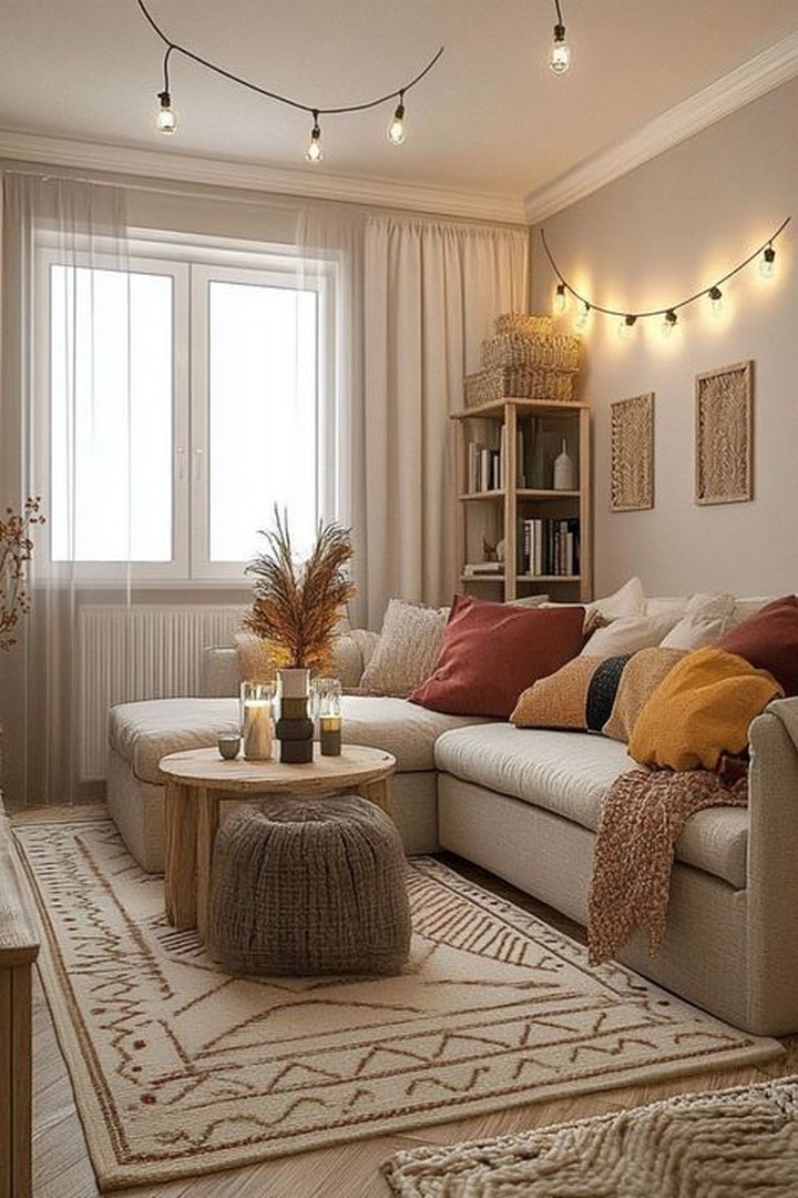 Drape warm white string lights around windows, doorways, or ceiling beams for a magical, ethereal glow that enhances the boho atmosphere.