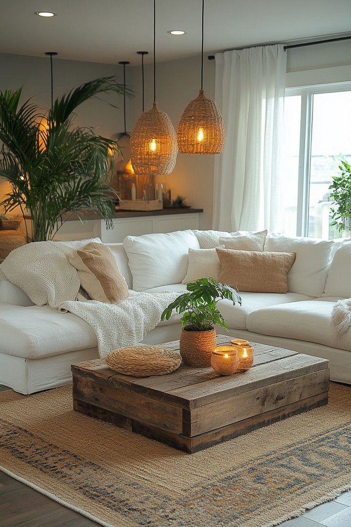 Raw-edge coffee tables, reclaimed wood shelving, or driftwood sculptures bring organic shapes and textures into your space.