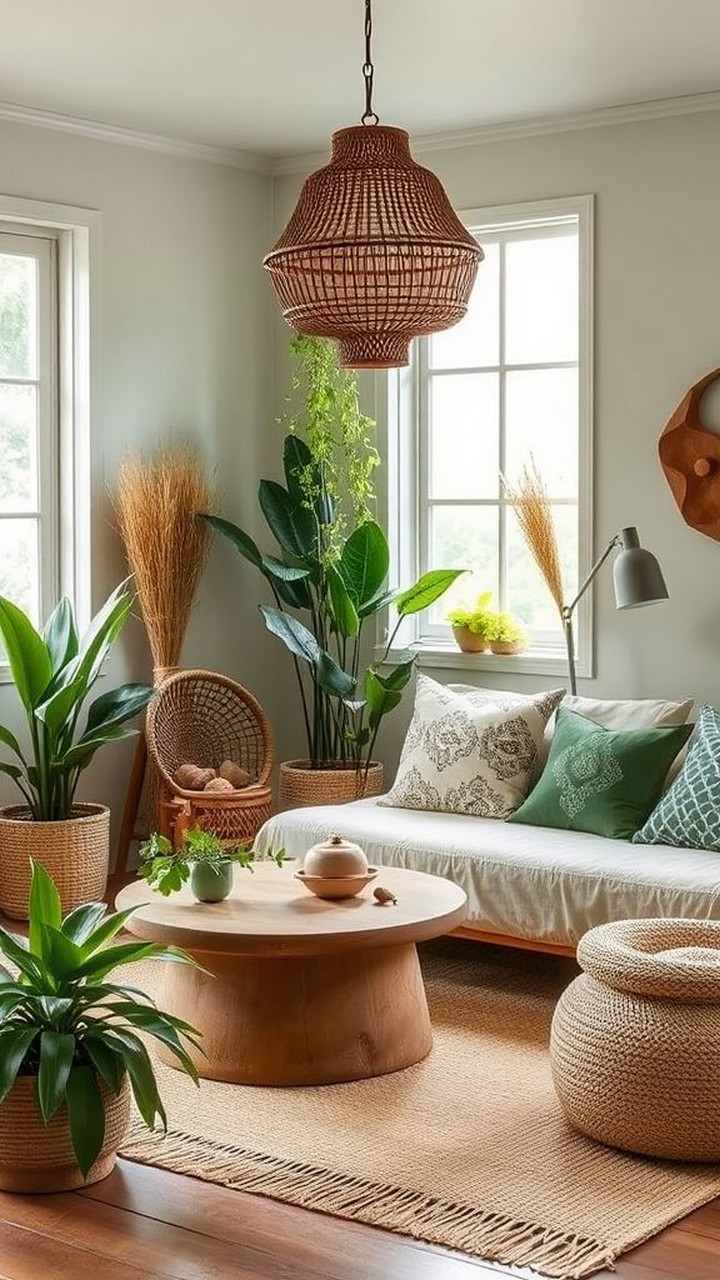 Natural fiber baskets serve double duty as stylish planters and storage solutions, adding texture while maintaining the organic feel.
