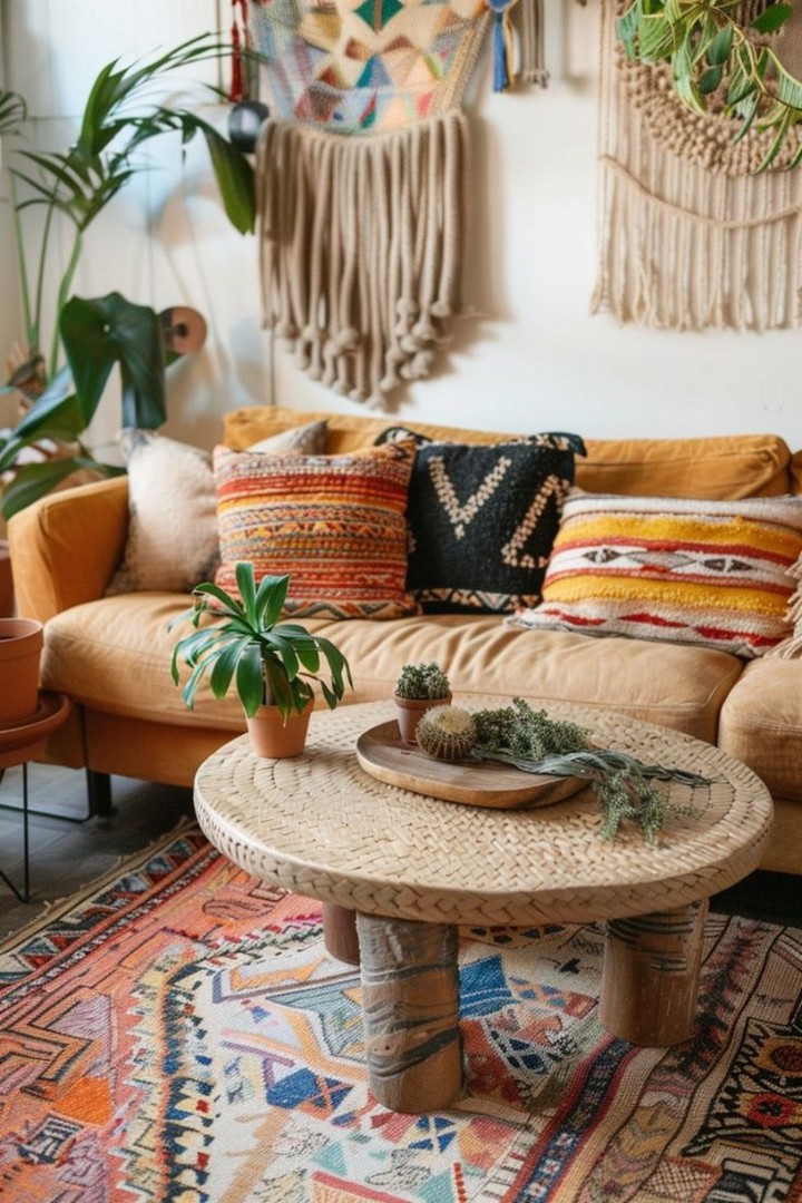 Woven pendant lights, Moroccan lanterns, or beaded chandeliers add ambient lighting while serving as sculptural elements.
