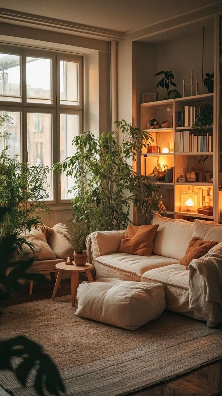 Combine comfortable seating, good lighting, and a small side table to create a cozy retreat within your living room that embodies the boho lifestyle.
