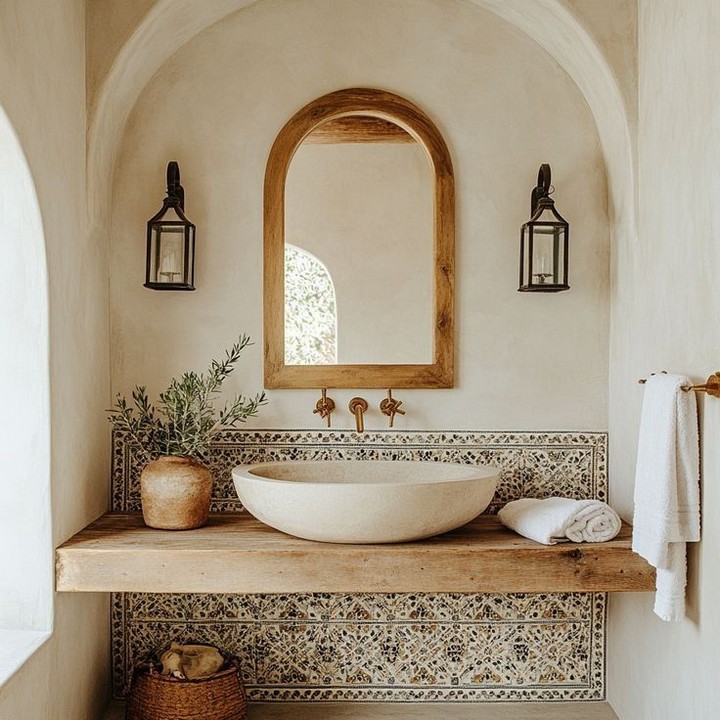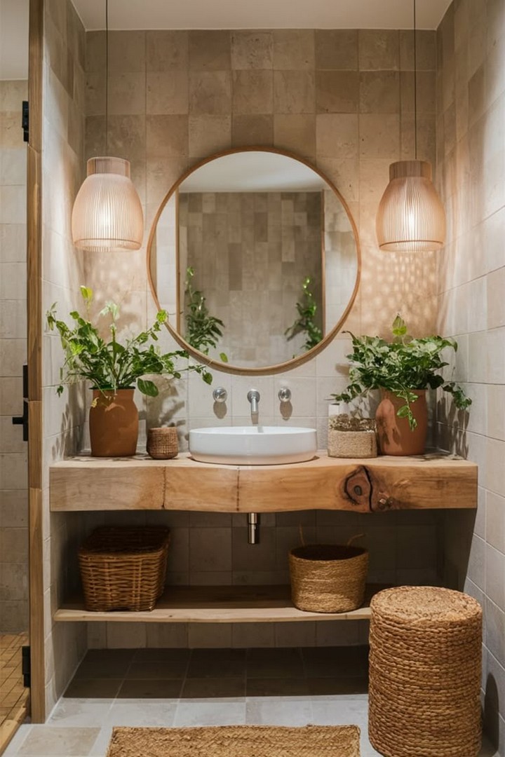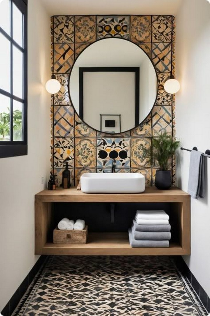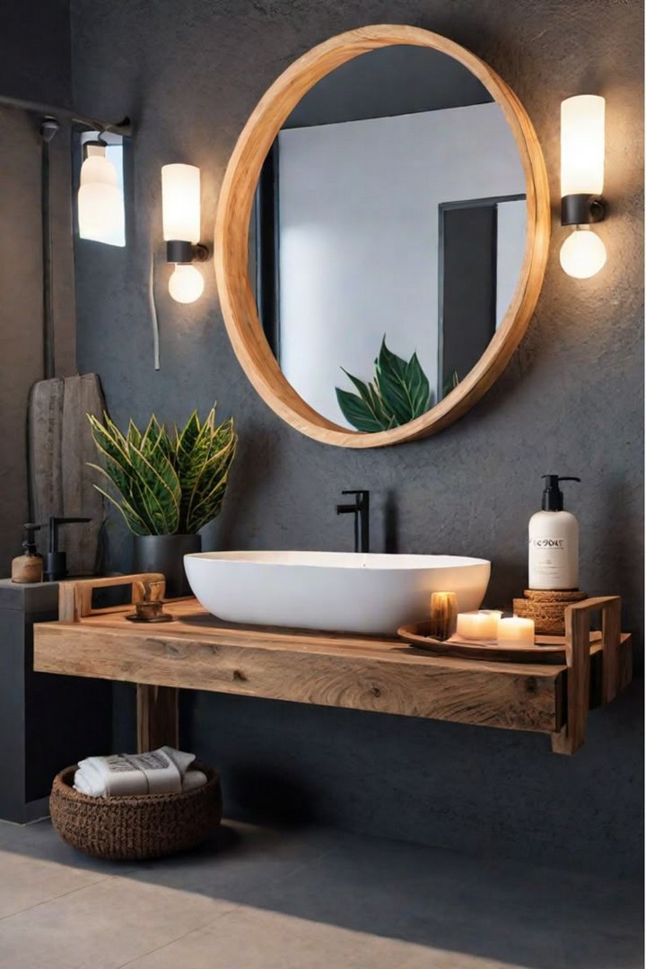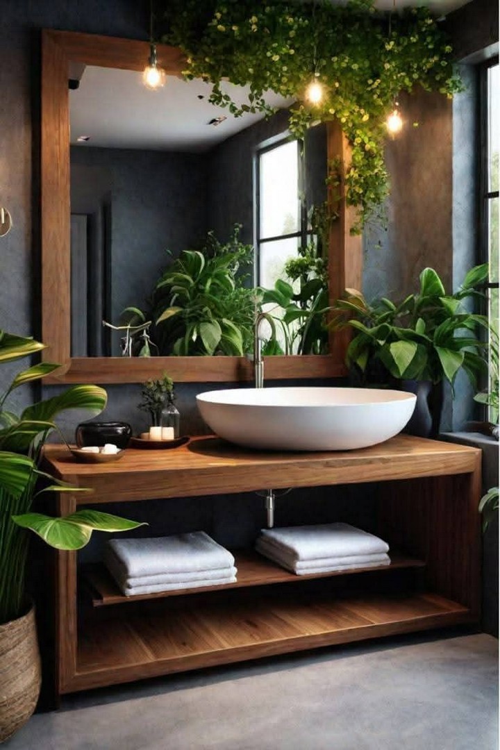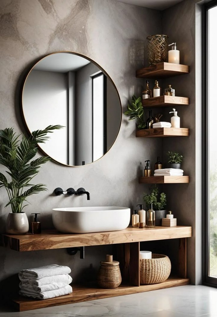 Using reclaimed wood for a washbasin base adds character and sustainability to the design, blending aesthetics with eco-consciousness.