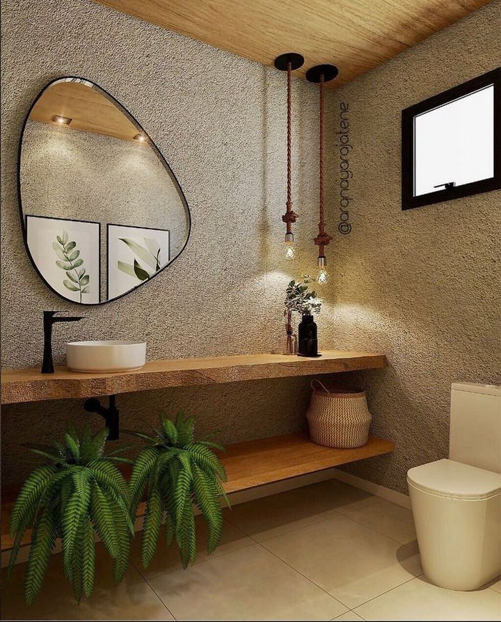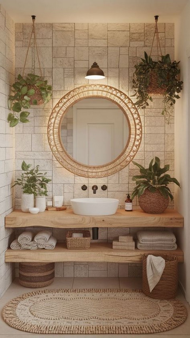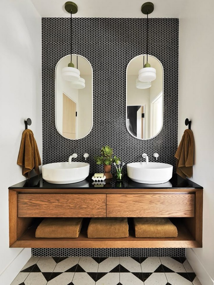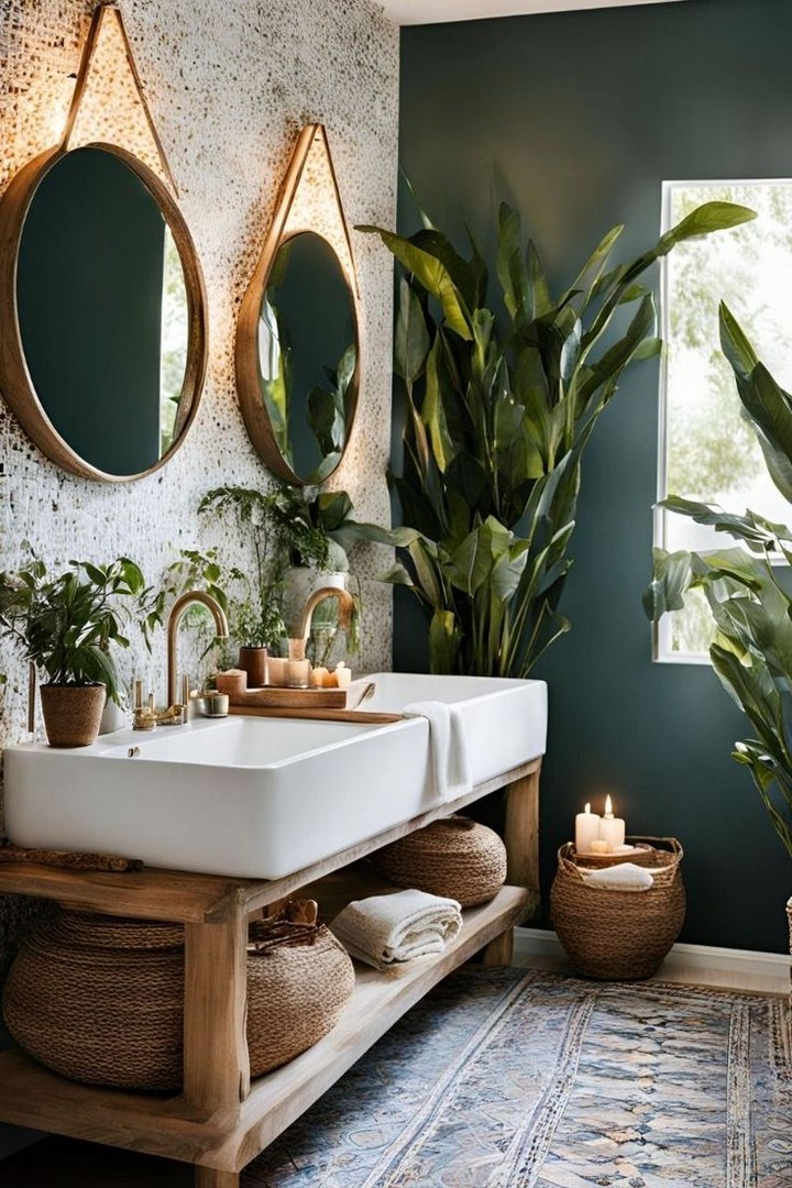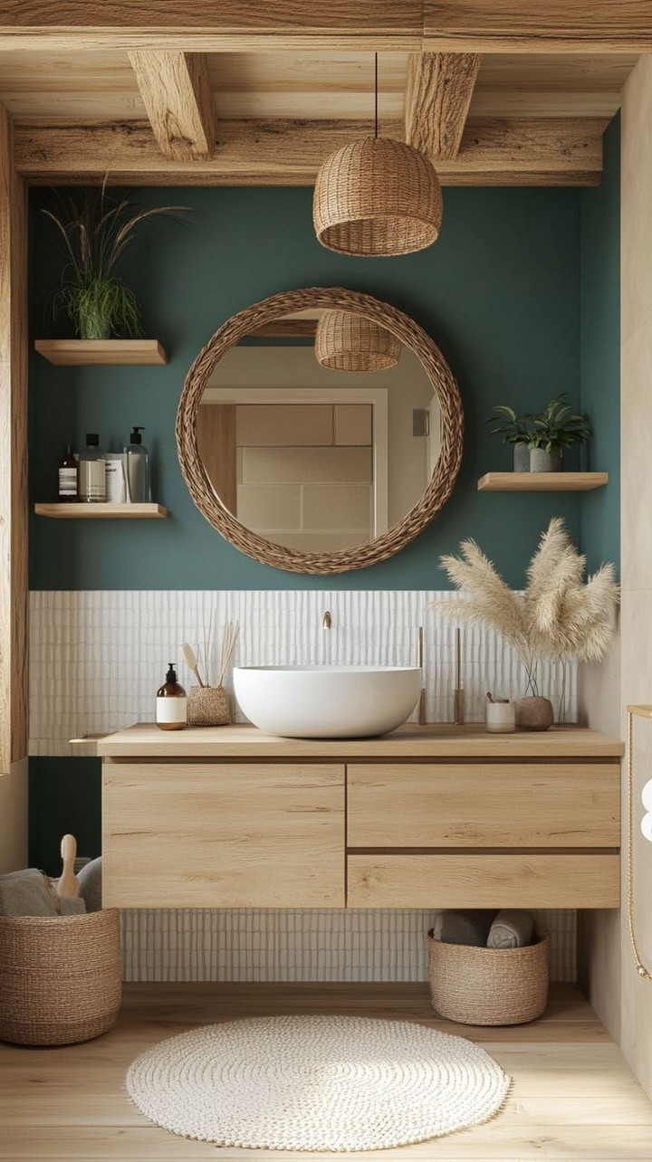 Using reclaimed wood for a washbasin base adds character and sustainability to the design, blending aesthetics with eco-consciousness.