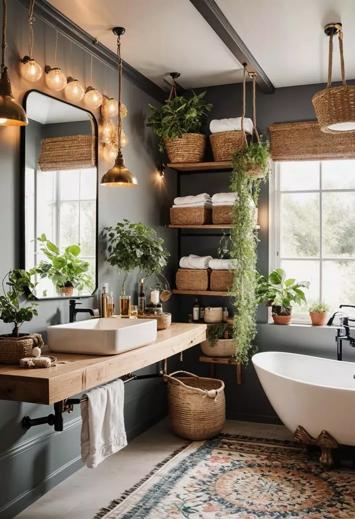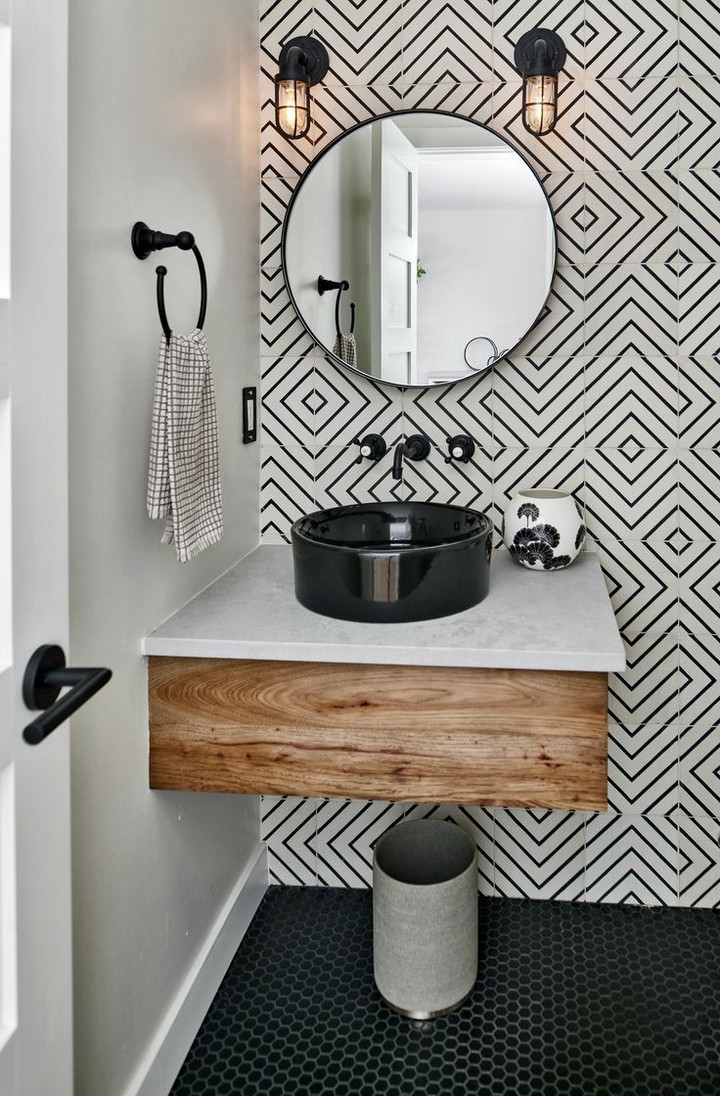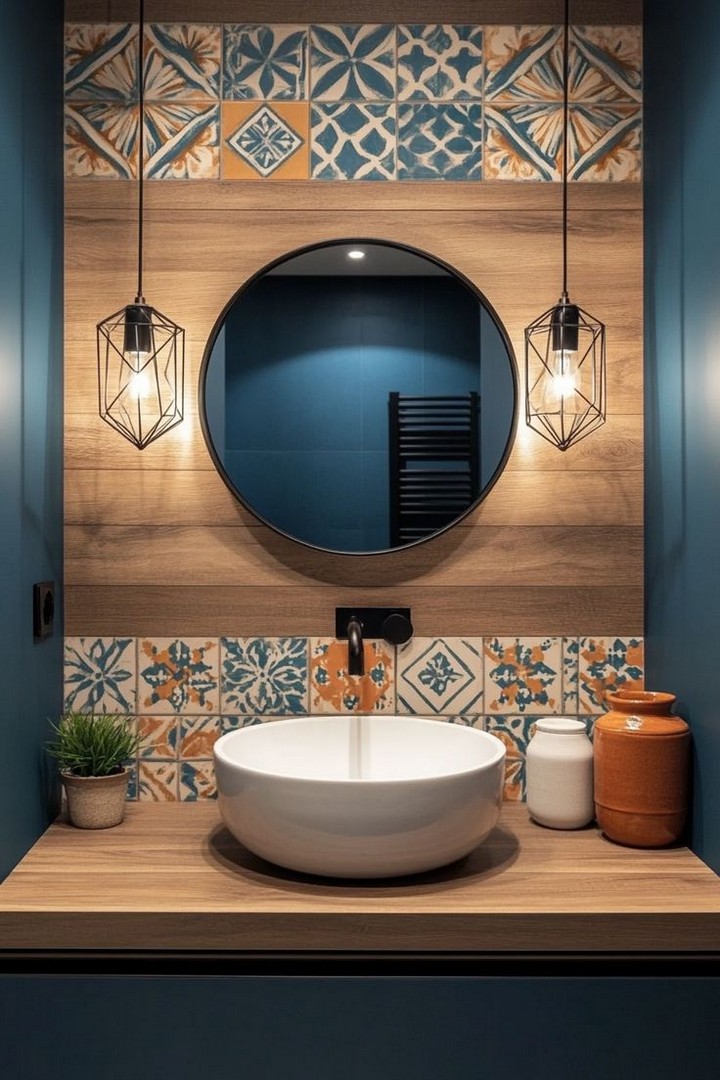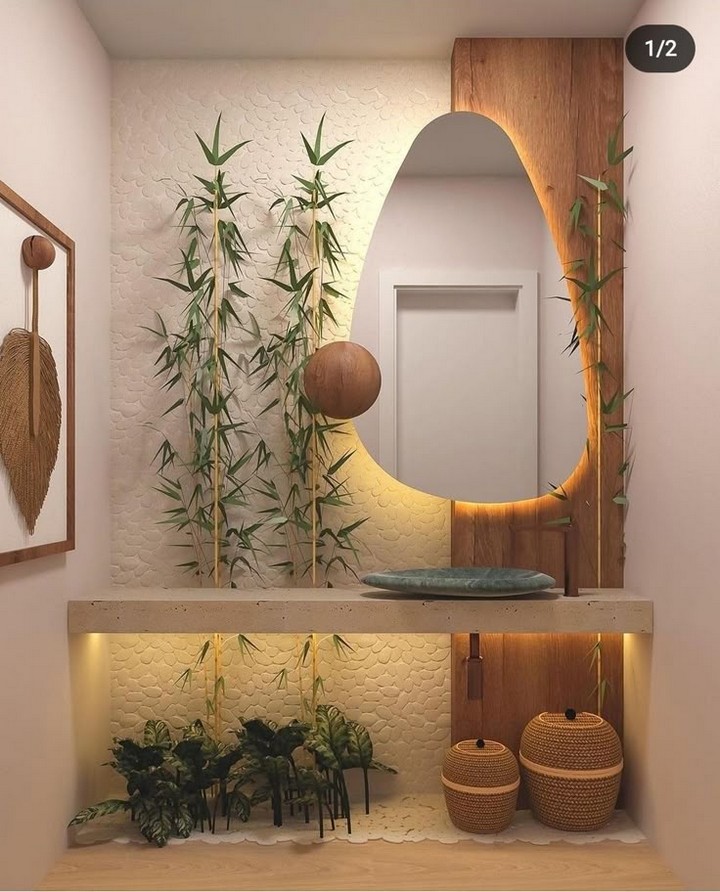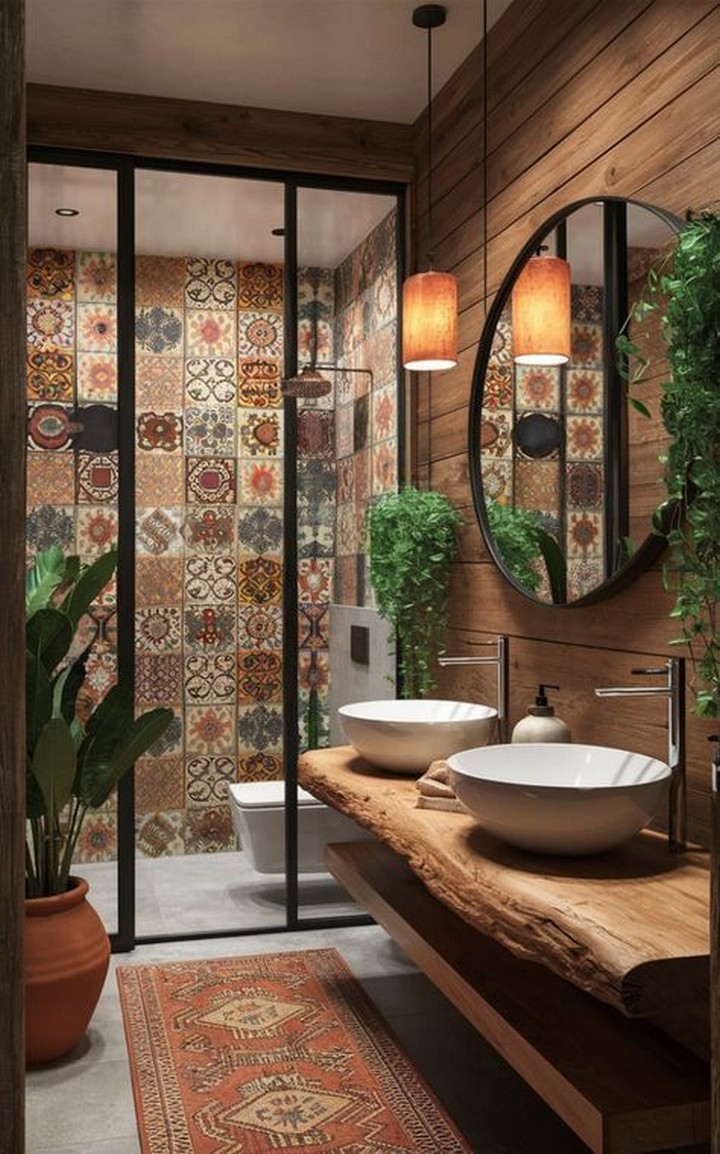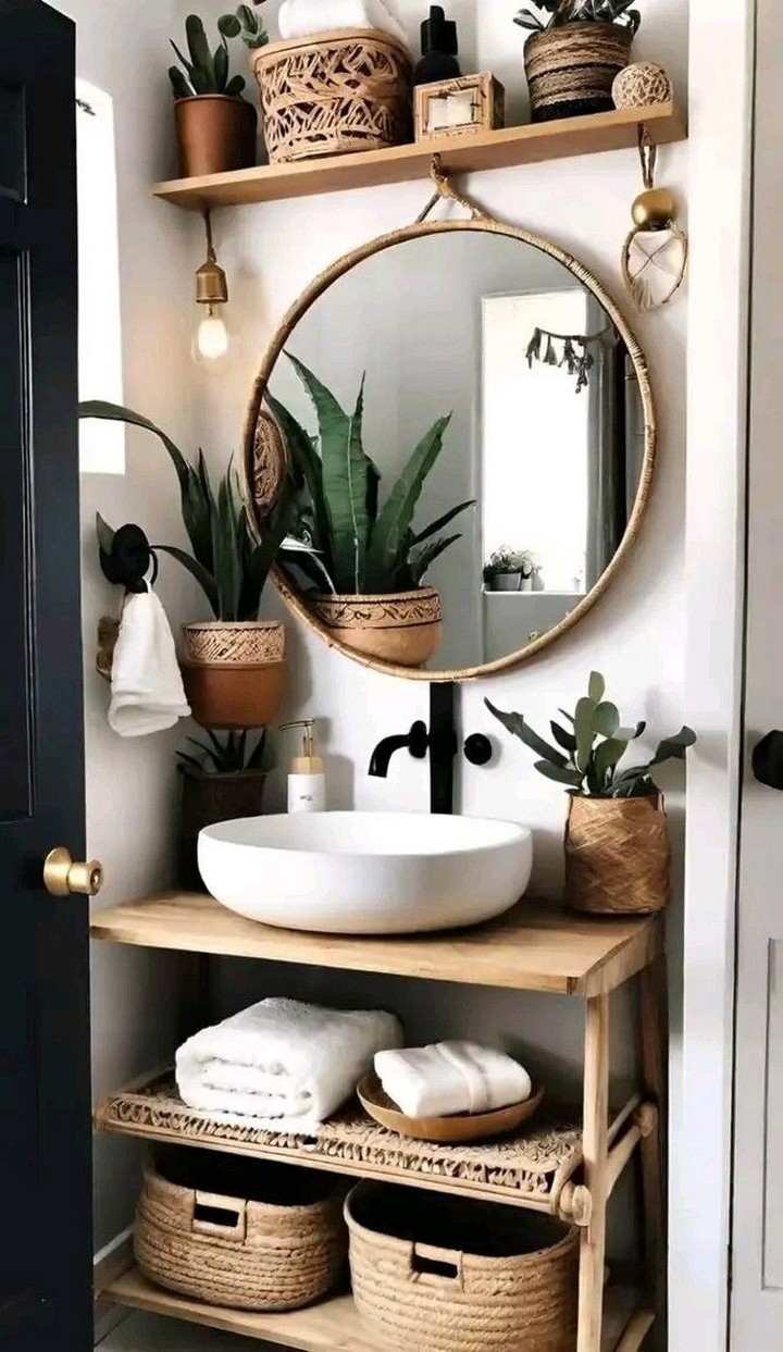 Using reclaimed wood for a washbasin base adds character and sustainability to the design, blending aesthetics with eco-consciousness.
