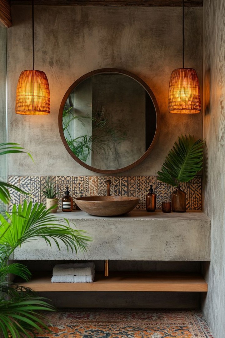 A hand-carved stone washbasin adds a bespoke touch, ideal for artistic and nature-inspired interior themes.