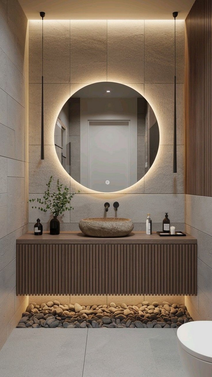 For an eco-friendly and rustic feel, a natural rock washbasin preserves the raw, unpolished beauty of stone.