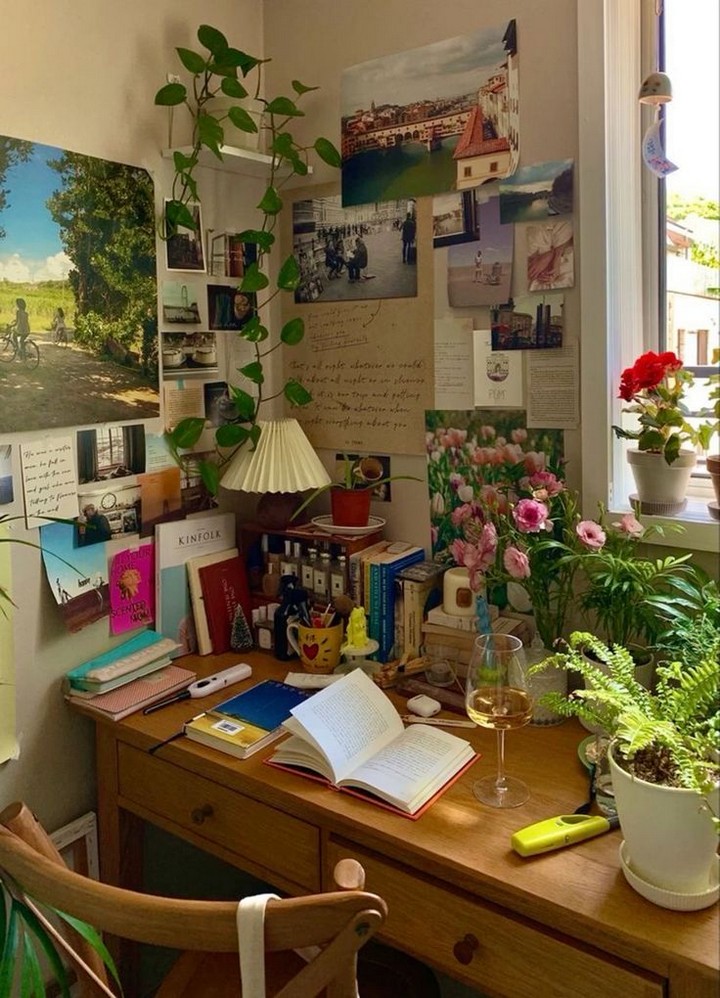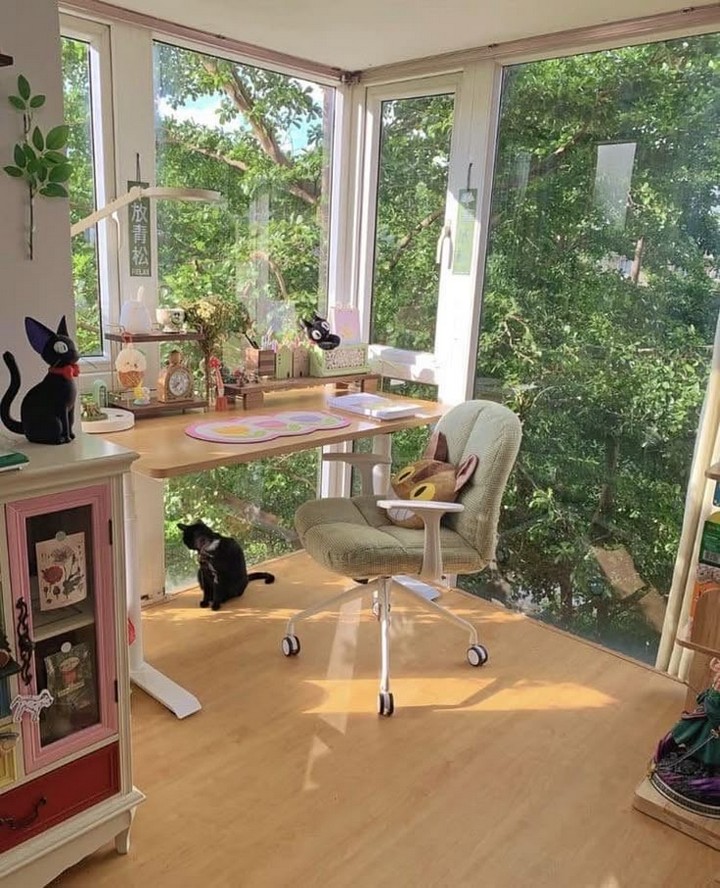 Set up a writing or sketching nook with a vintage desk, lamp, and supplies. Channel your inner Ghibli protagonist with a creative corner for reflection and imagination.