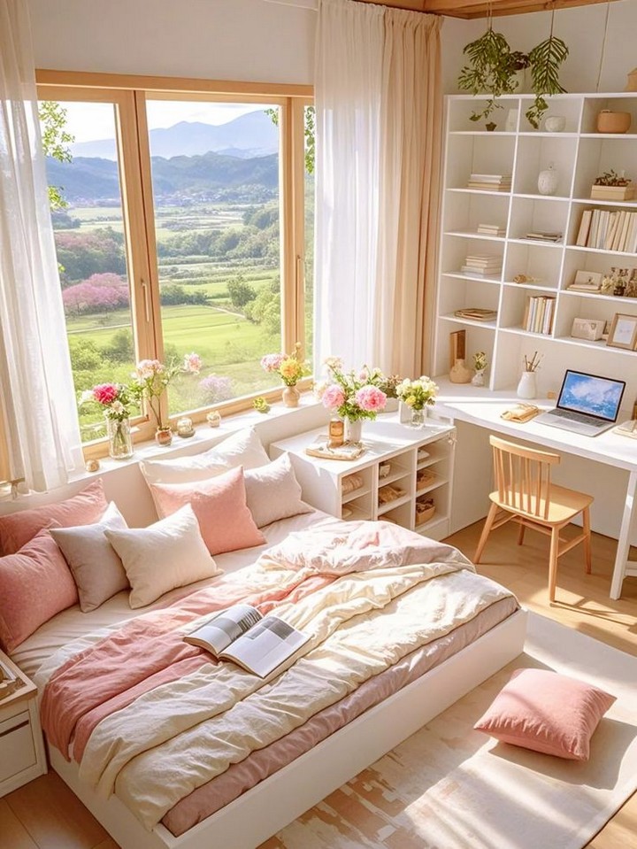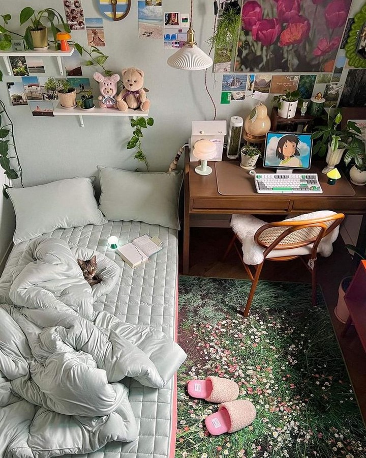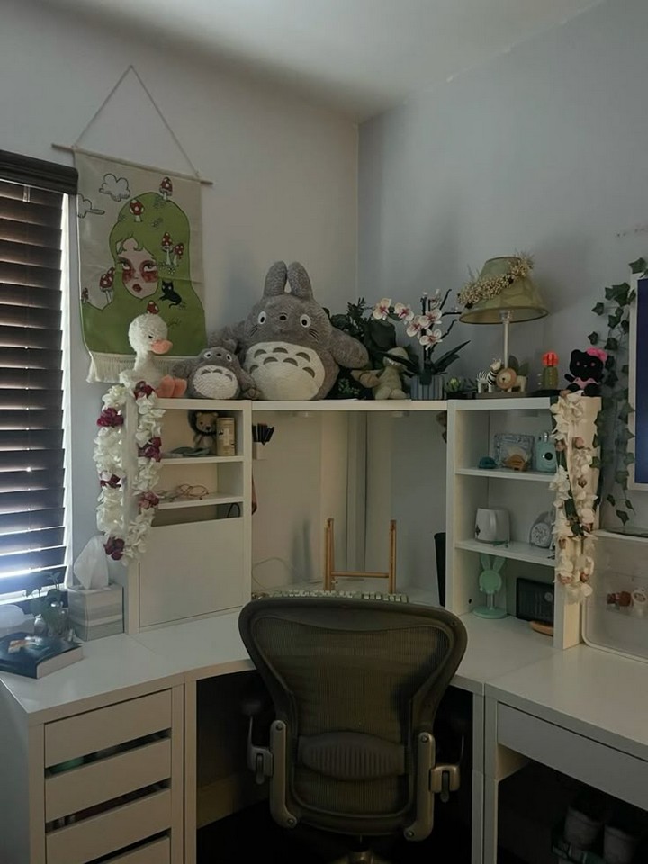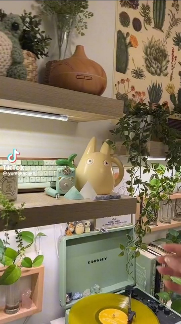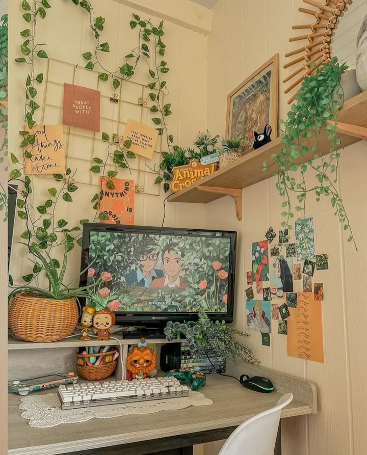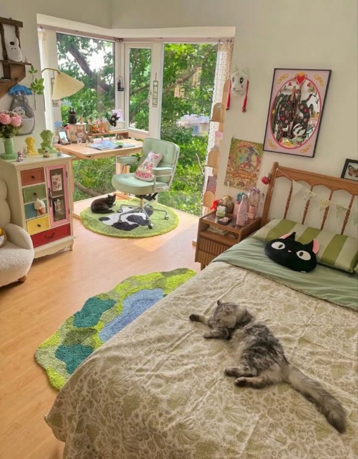 Stick to calming hues like sage green, dusty rose, cream, and warm browns. These colors provide a gentle, vintage ambiance and set the mood for a tranquil, Ghibli-inspired retreat.