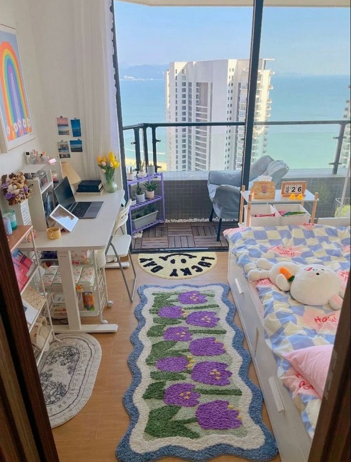 Use jute, cotton, or woven wool rugs to ground your space with texture. Ghibli spaces feel earthy and real, and these rugs make your room more inviting and layered.