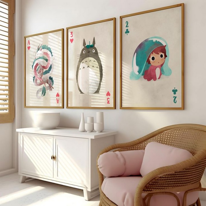 Frame prints of plants, mushrooms, or hand-painted florals. Nature is central to Ghibli’s themes, and these motifs emphasize a sense of harmony and beauty.