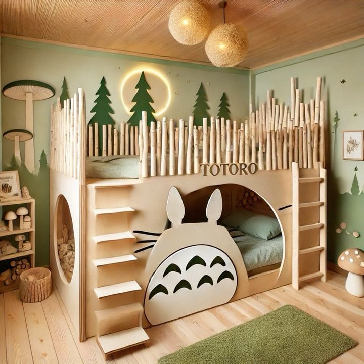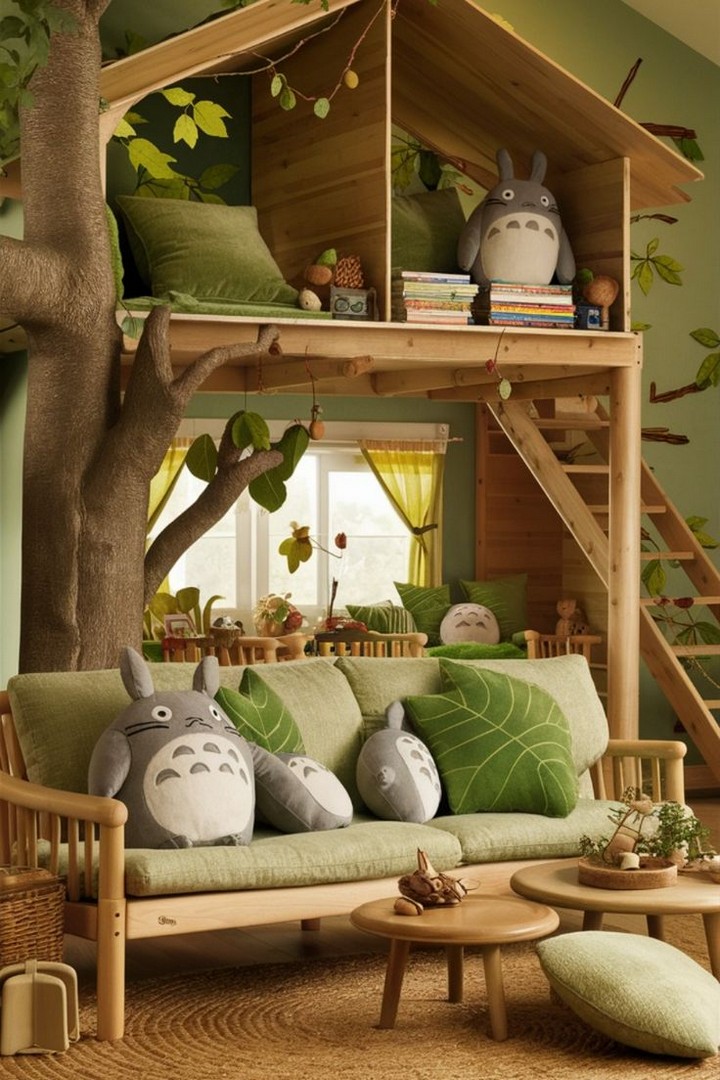Create a dreamy sleeping nook with sheer fabric draped above your bed to mimic a forest canopy. Add a Totoro plush or bedding for a magical, cozy focal point that evokes the comfort and charm of My Neighbor Totoro.
