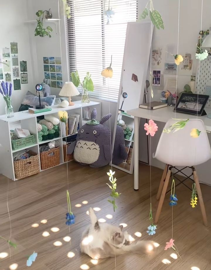Add embroidered cushions or wall hangings featuring animals, flowers, or landscapes. Handcrafted textiles carry a personal, nostalgic charm and blend beautifully with the Ghibli theme.