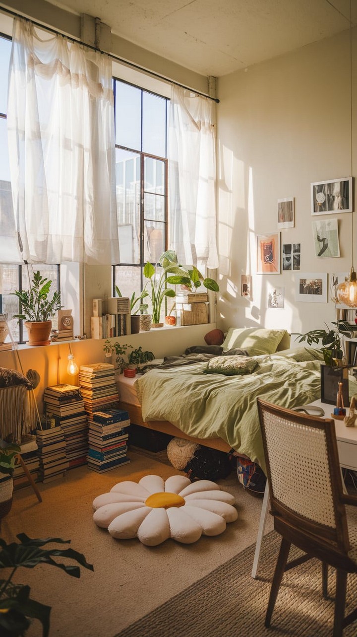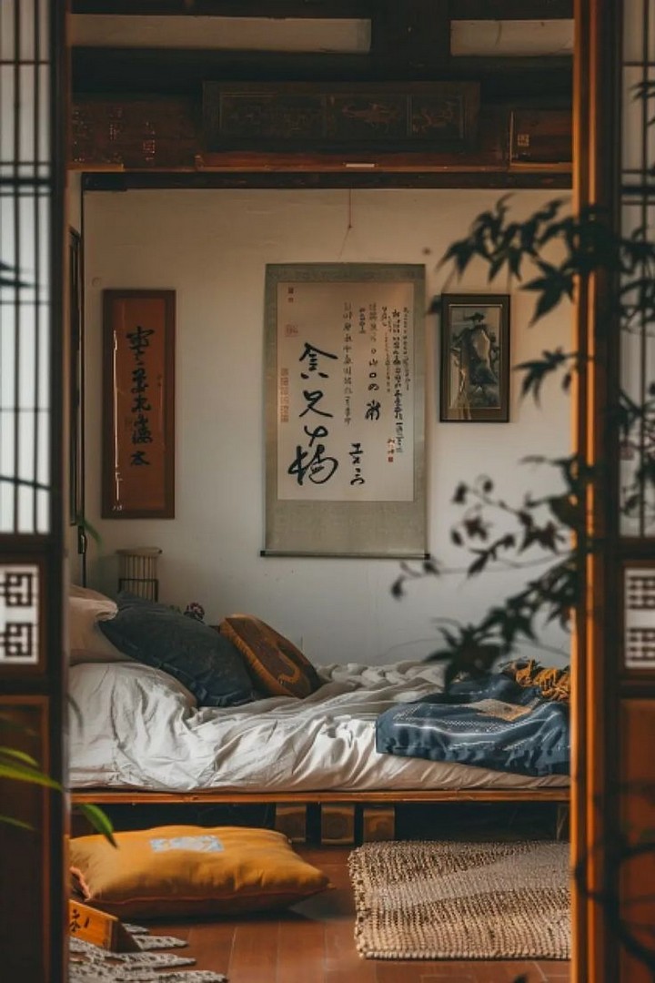 Layer your space with vintage quilts, embroidered pillows, and soft throws. Mixing patterns and fabrics adds visual interest and mirrors the eclectic warmth of a Ghibli home.