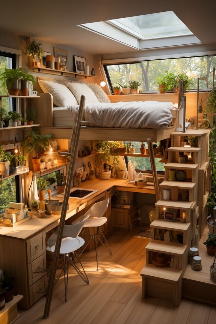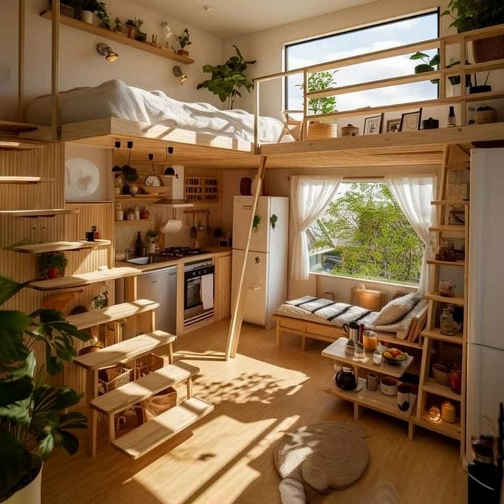 Use rustic ladder shelves to display small potted plants, candles, and Ghibli knick-knacks. Their vertical design adds charm while maximizing small space storage.