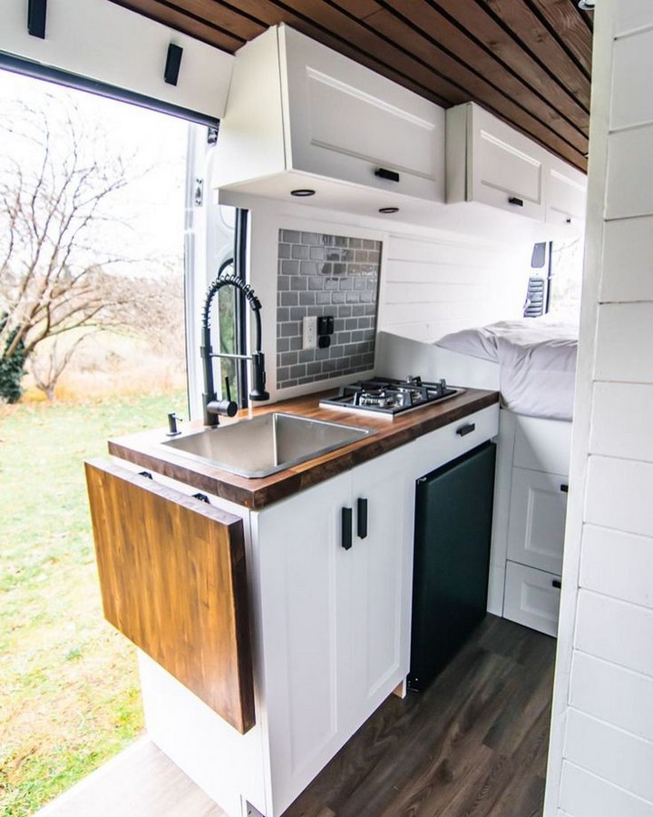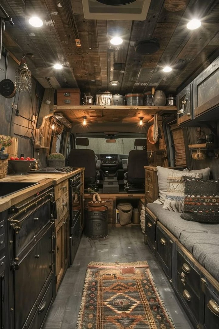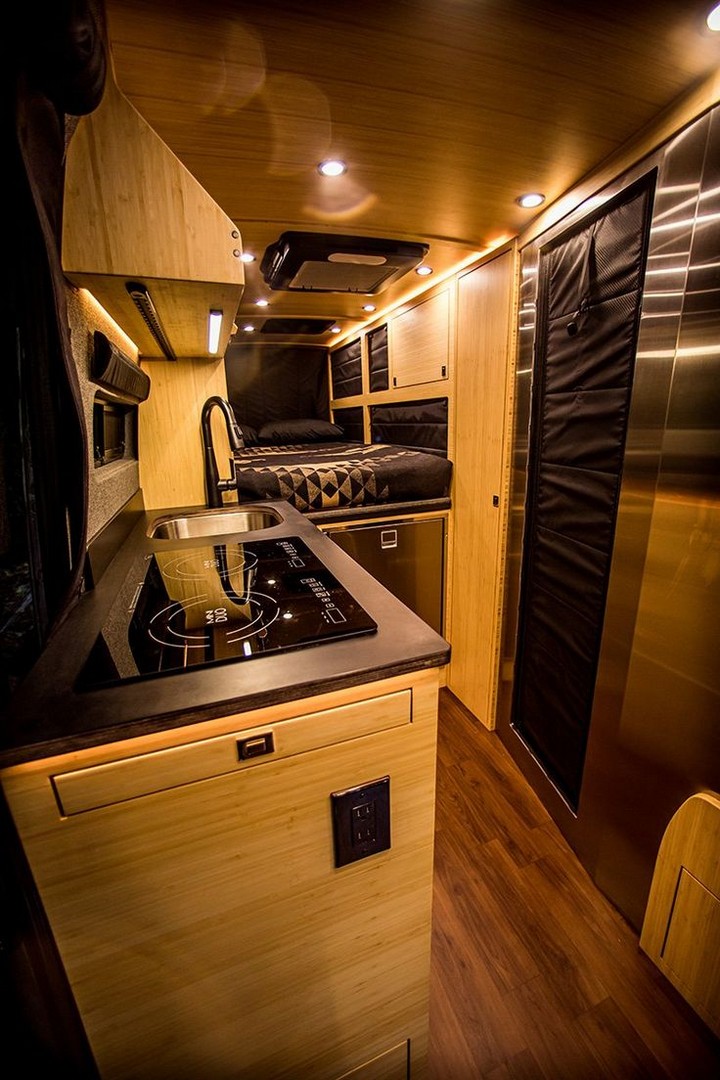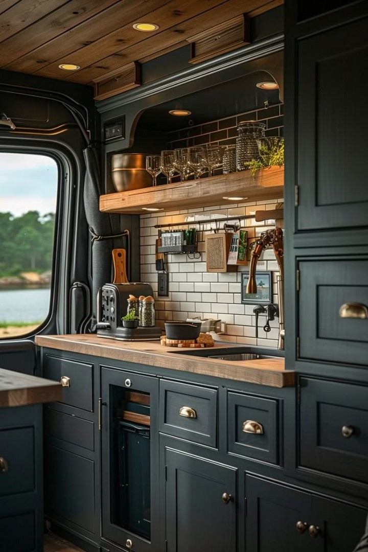 Exposed pipes, matte black cabinets, and brushed metal counters give this kitchen an edgy urban feel. It’s ideal for digital nomads who love a loft-style aesthetic. Add Edison bulb lighting and dark tile backsplash for a van kitchen that feels as sleek as your favorite downtown café.