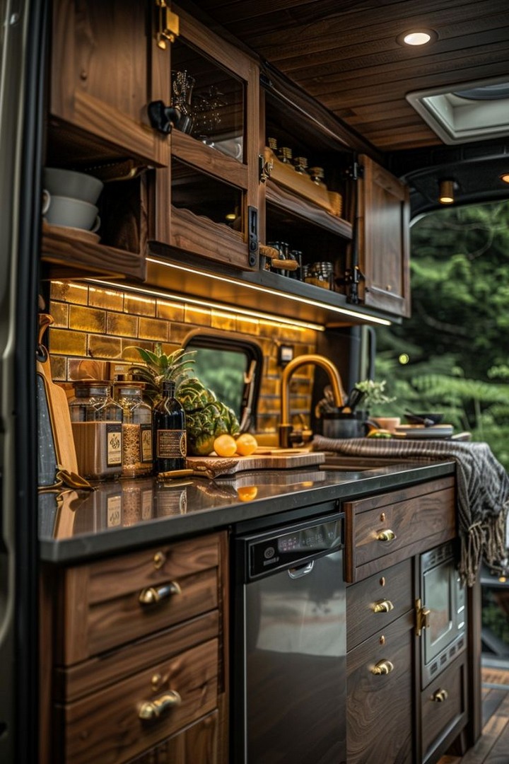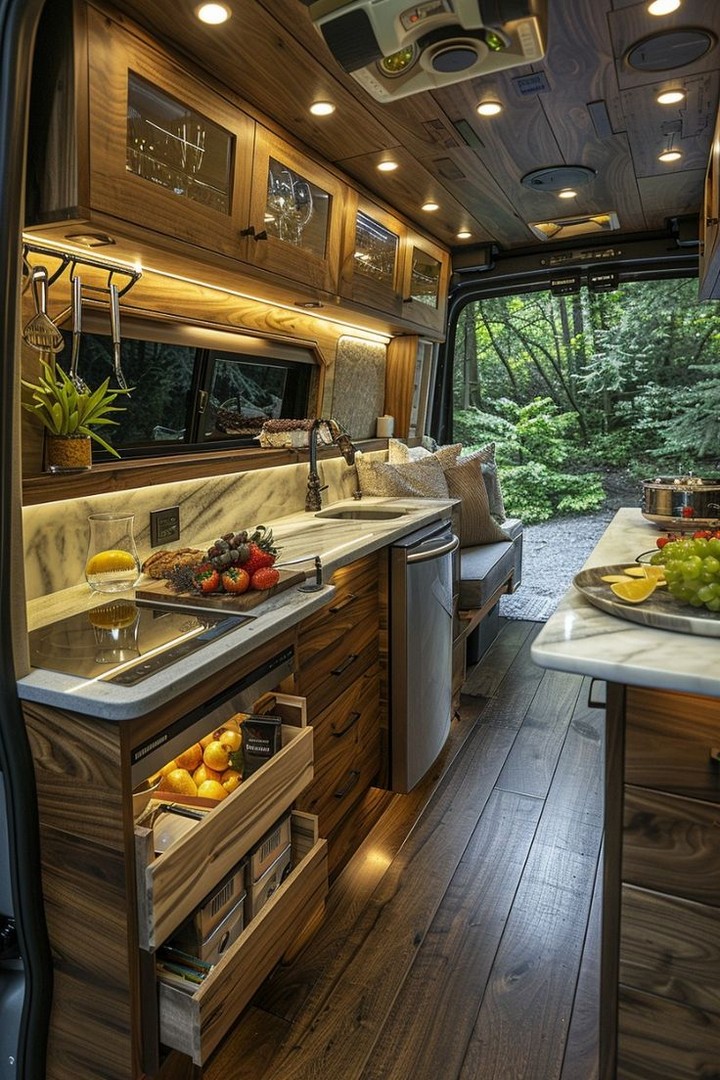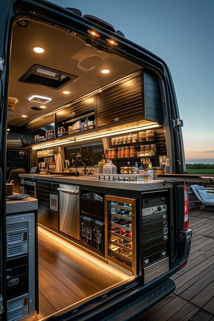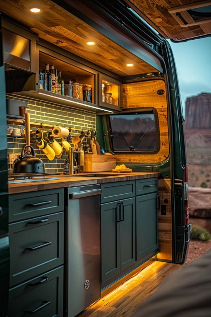 Install LED strips beneath cabinets to create warm, efficient lighting at night. Dimmable options offer ambiance and visibility without draining your power bank. This upgrade feels luxurious, enhances nighttime cooking, and sets the mood whether you’re parked in the desert, forest, or driveway.