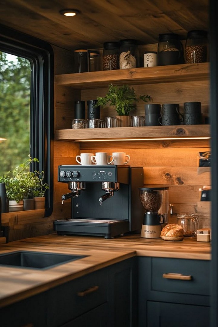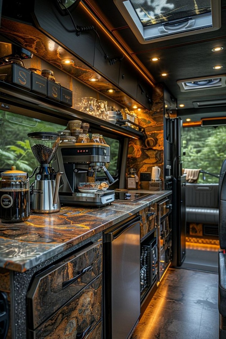 Coffee lovers rejoice with a mini espresso bar featuring a 12V machine, manual grinder, and mounted mug rack. Add a water line and small shelf for beans and syrups. It’s a daily luxury that turns your van into a rolling café—perfect for slow mornings and workdays.