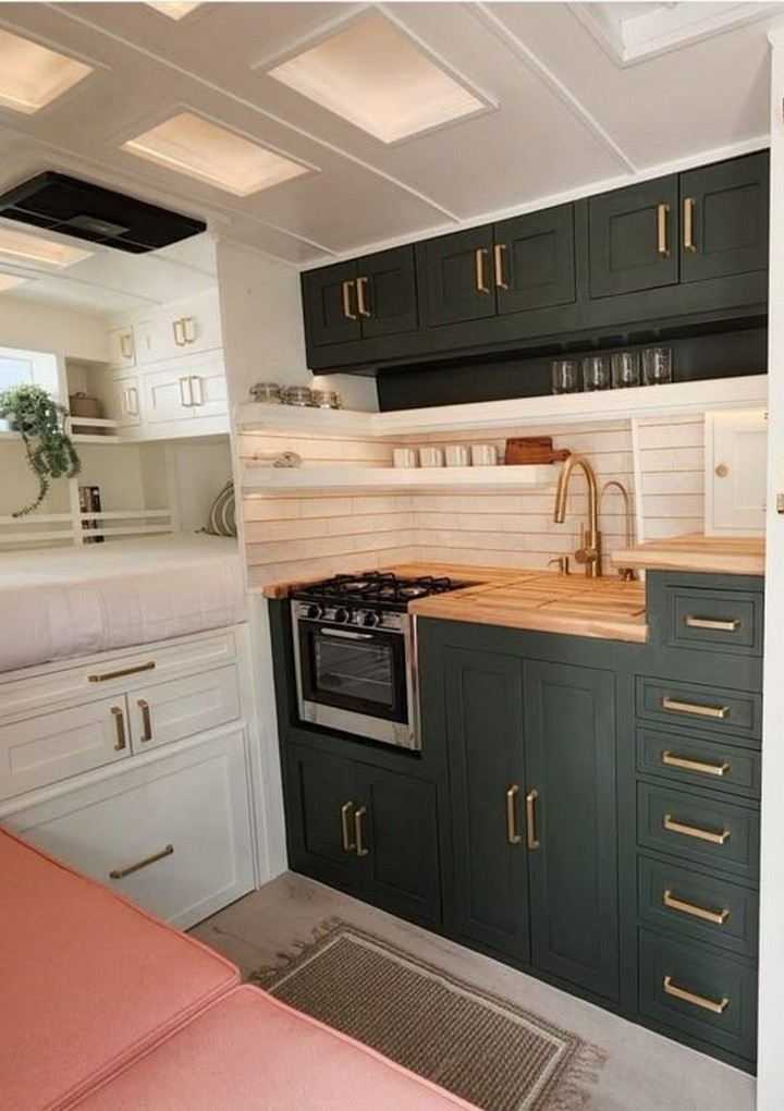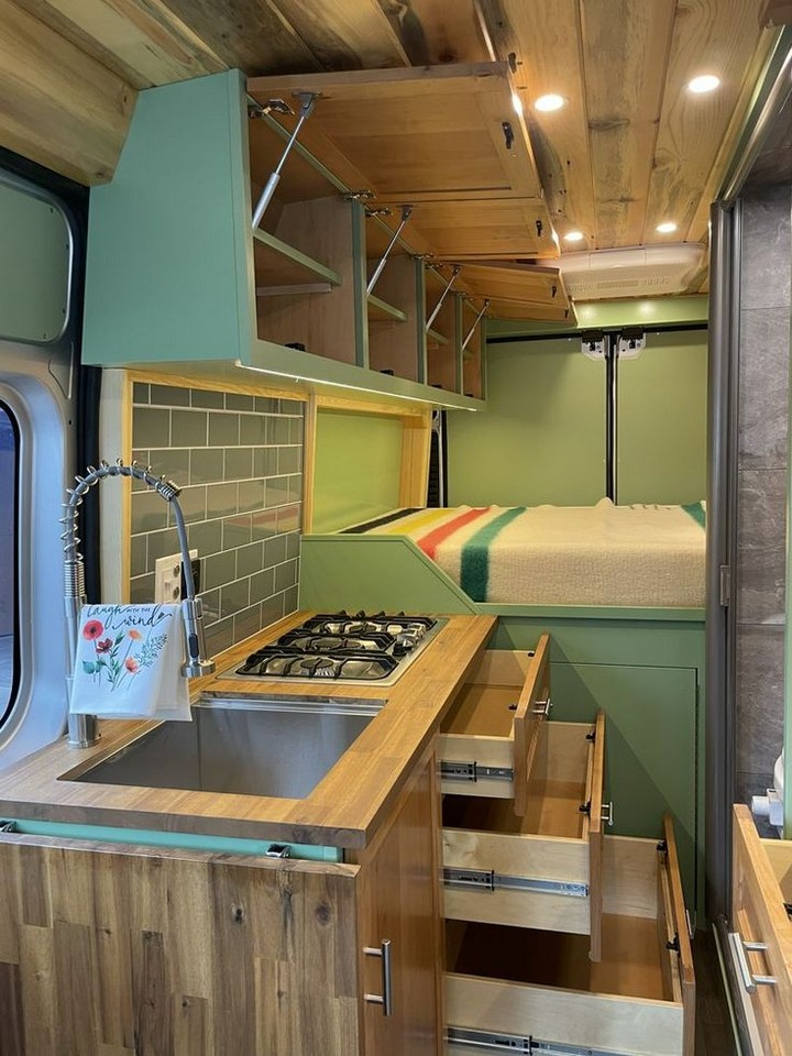 Add retro charm with mint-green cabinets, checkered flooring, and rounded knobs. Install a tiny enamel sink and use brass or copper accents to complete the look. This playful, nostalgic style adds personality to your van while still offering practical features for daily meal prep and cleanup.