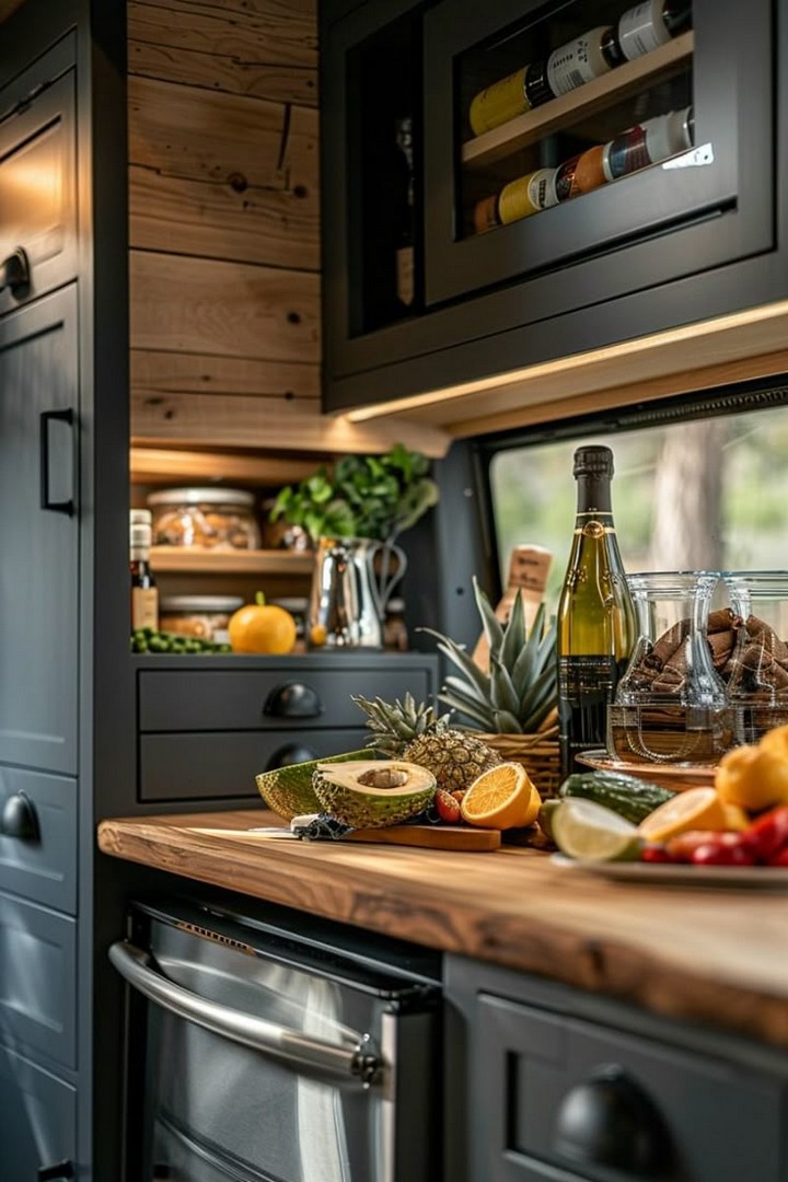 Build narrow shelves sized specifically for spice containers into otherwise unusable gaps. Consider magnetic options that secure spices during travel.
