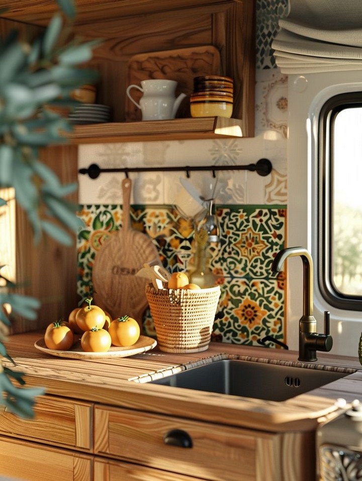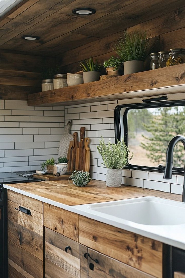 Express your style through a distinctive backsplash that’s both practical and beautiful. Options range from vinyl peel-and-stick tiles (lightest weight) to thin stone veneer (for luxury builds). This relatively small area allows for personality without adding significant weight.