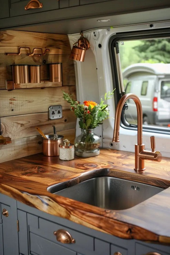 Select materials with naturally antibacterial properties like copper countertop edging or bamboo cutting surfaces. These choices help maintain hygiene in limited-water situations.