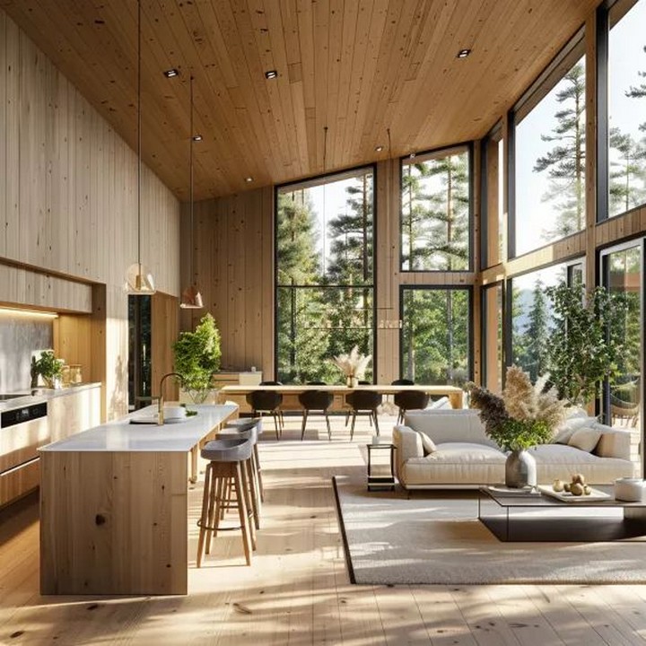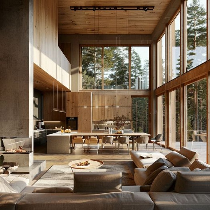 Polished or board-formed concrete brings contemporary industrial character while providing practical, durable surfaces. Often used for flooring, countertops, or architectural elements, concrete’s neutral tone and subtle variations complement wooden elements beautifully.