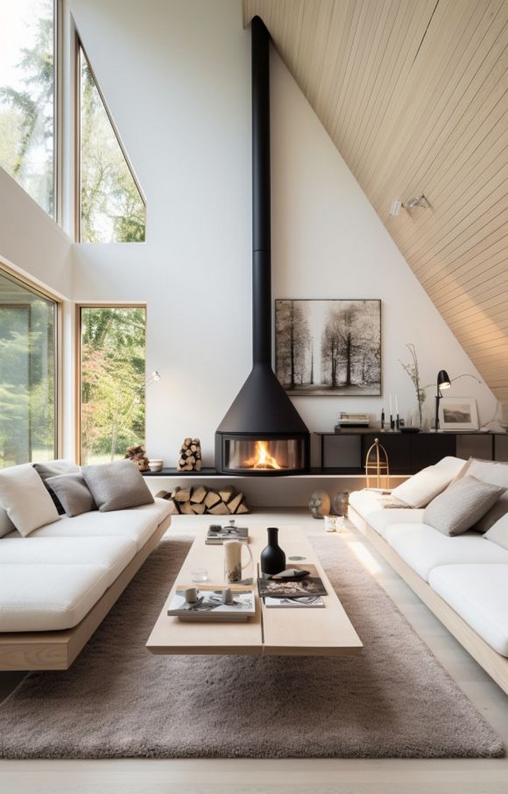 A central hearth often featuring a minimalist wood-burning stove rather than a traditional fireplace serves as both a functional heating element and a gathering point. The visual focus of dancing flames against clean design creates the quintessential Scandinavian concept of “hygge” or cozy contentment.