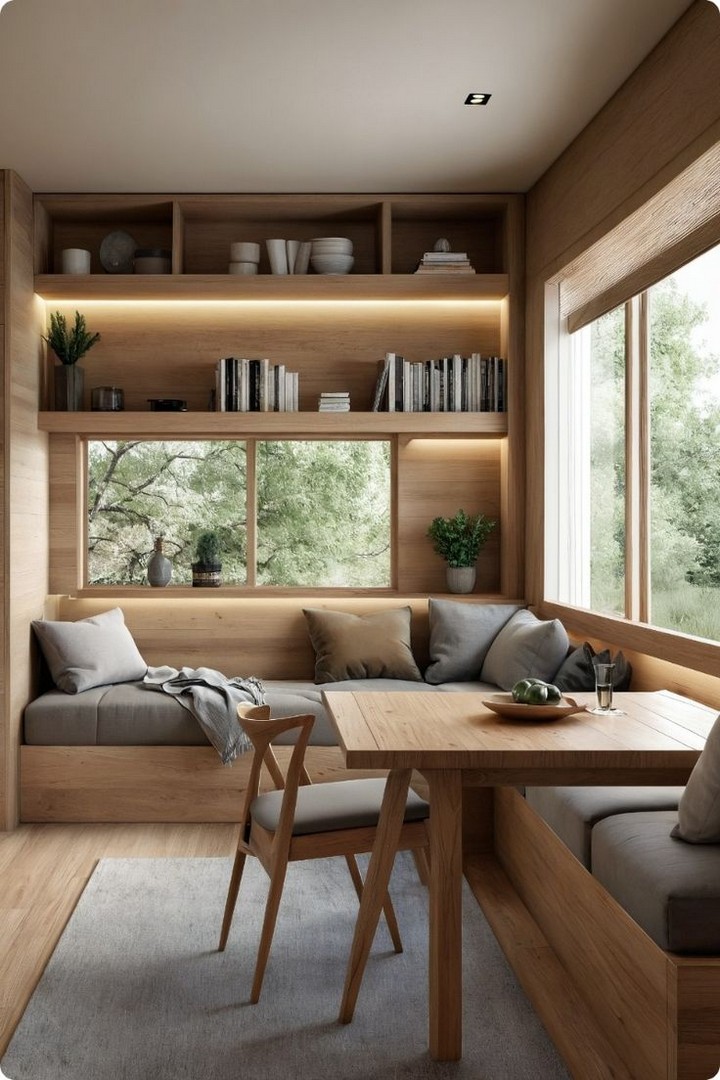 Space-efficient built-ins window seats, dining nooks, or storage walls maximize functionality while maintaining clean lines. These elements often serve multiple purposes, such as bench seating with hidden storage or staircases with integrated bookcases.