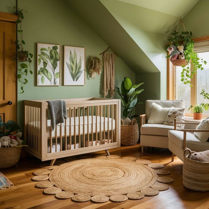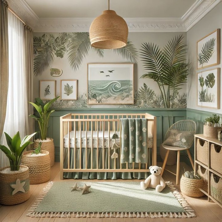 Incorporate storage solutions that complement your theme. Seagrass, jute, or rattan baskets organized around the room can hold diapers, toys, blankets, and other necessities while contributing to the organic, textural landscape of your nursery. Look for varying shapes and weaves to add visual interest.
