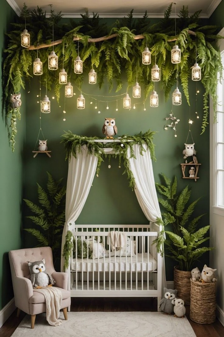Create or purchase a chandelier or mobile made from natural branches. These can be adorned with small woodland figurines, preserved moss, felt stars, or delicate fairy lights. Positioned over the crib or changing area, this organic lighting feature creates gentle movement and visual interest for your baby.