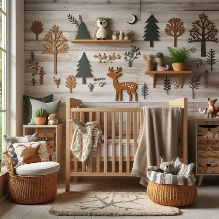 Mount wooden cutouts of woodland creatures like deer, foxes, and owls on the wall in a playful arrangement. These can be purchased unfinished and customized with paint to match your color scheme, or left natural for a more rustic look. Position them to create a scene that tells a story across your wall.