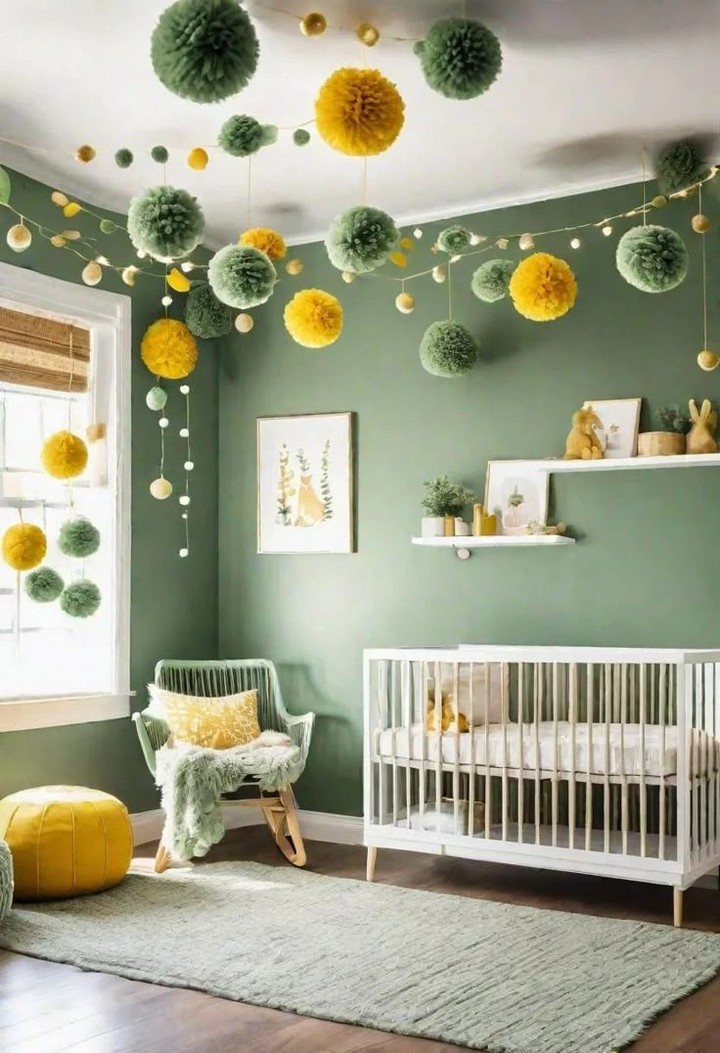 Install a flowing macramé or gauzy fabric canopy above the crib to create a dreamy focal point. This bohemian staple adds vertical interest to the room while creating a sense of cozy enclosure for your baby. Just be sure to secure it well and position it so it cannot be reached from the crib for safety.