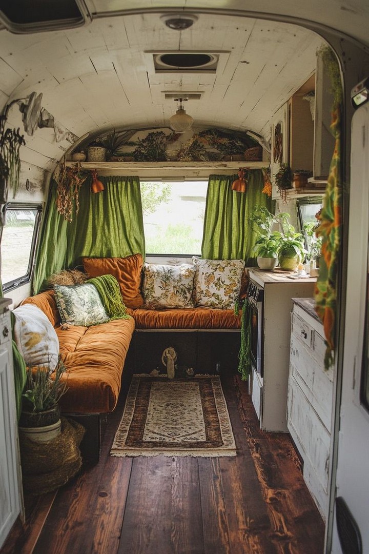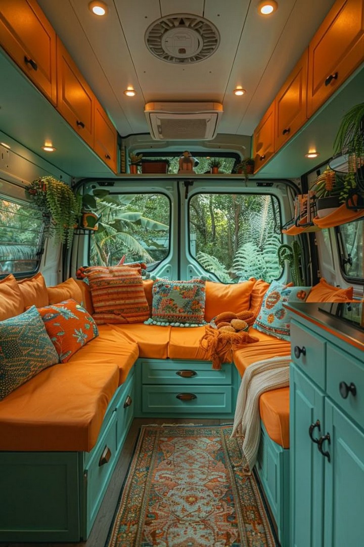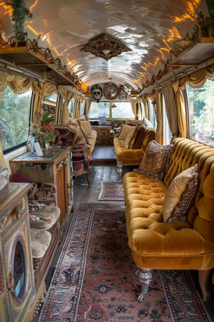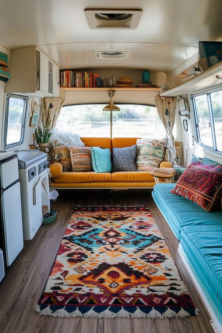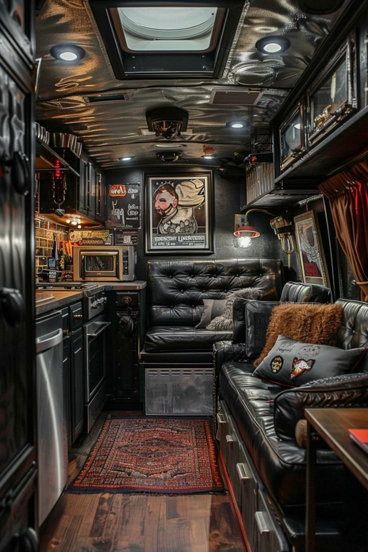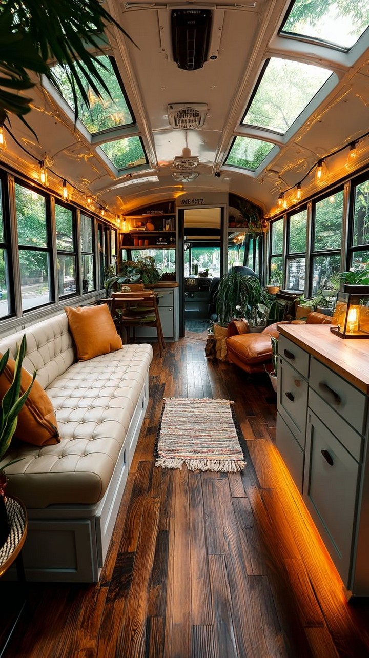 For those who value gathering and recreation, skoolie living areas can be optimized for entertainment. These designs might include surround sound systems, projector screens that descend from the ceiling, gaming stations, or conversation pits with comfortable seating arranged for interaction.
