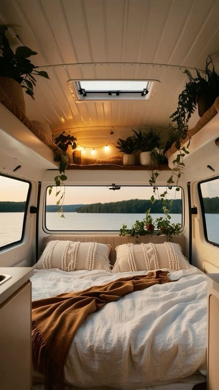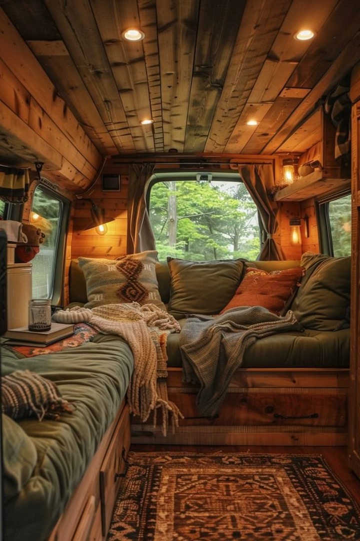 Positioning the bed to maximize views creates magical moments on the road. This concept typically places the mattress perpendicular to the bus length against the rear emergency door or along a wall with extensive windows, allowing occupants to wake up to changing landscapes.