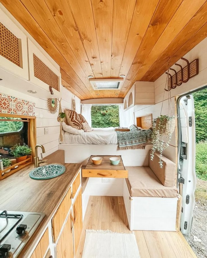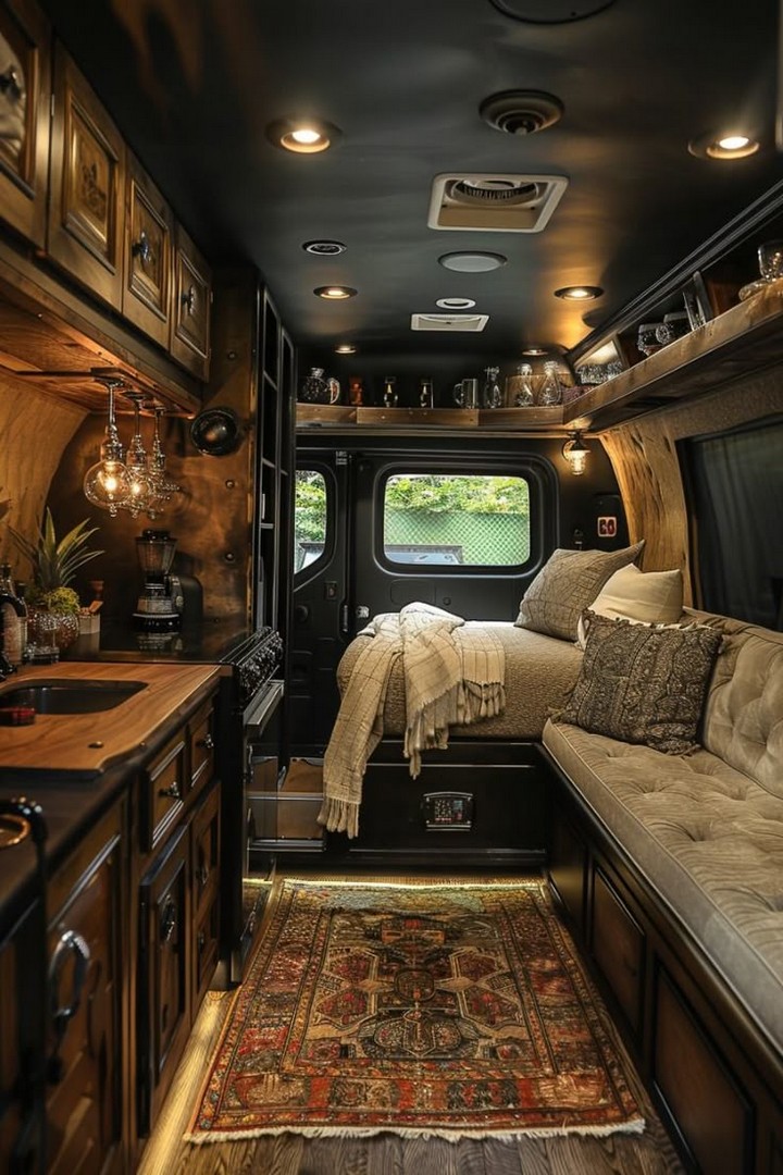 In smaller skoolies, dedicating permanent space to a bed isn’t always practical. Convertible solutions transform sleeping areas into functional daytime living spaces through mechanical or manual conversions.
