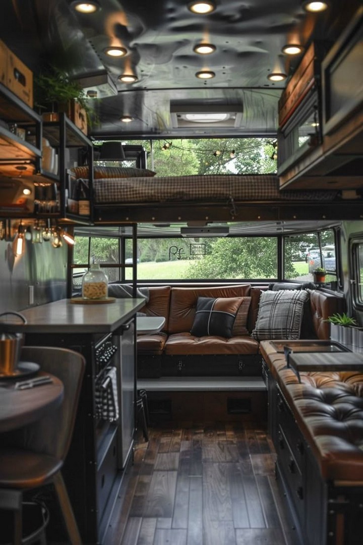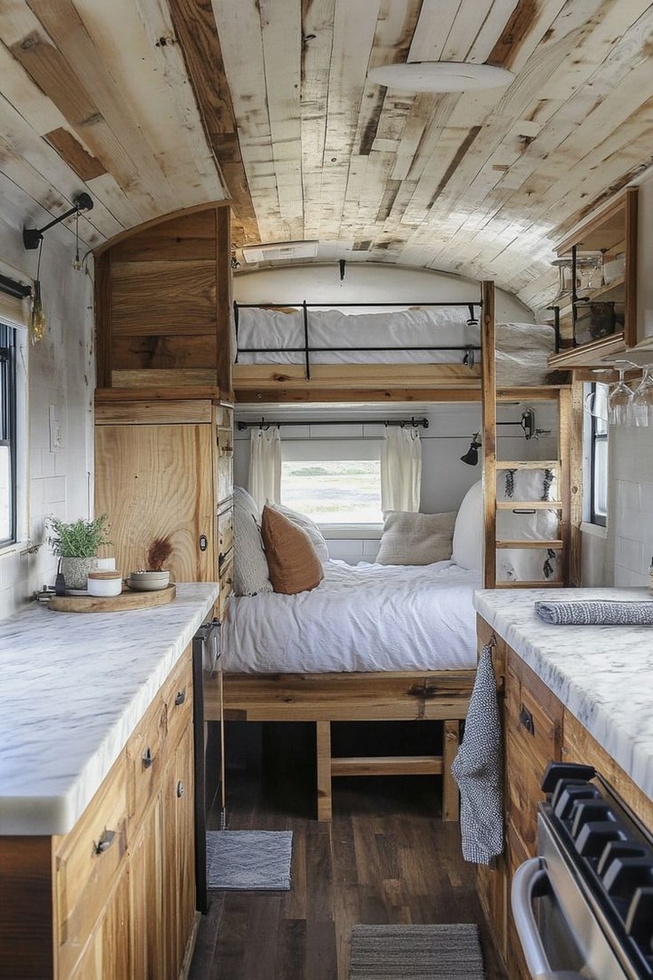 The elevated platform can create a cozy sleeping nook with a built-in feel, especially when paired with reading lights and small storage niches for books and personal items. Some conversions extend this platform partially across the width of the bus, creating a split-level effect that adds visual interest and functional zoning.