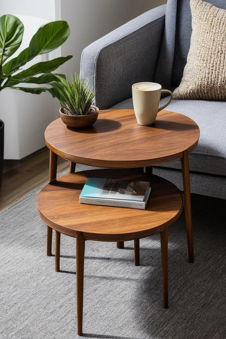 Use nested tables combining materials like marble tops with brass legs or wood surfaces with metal frames for visual interest and functionality.