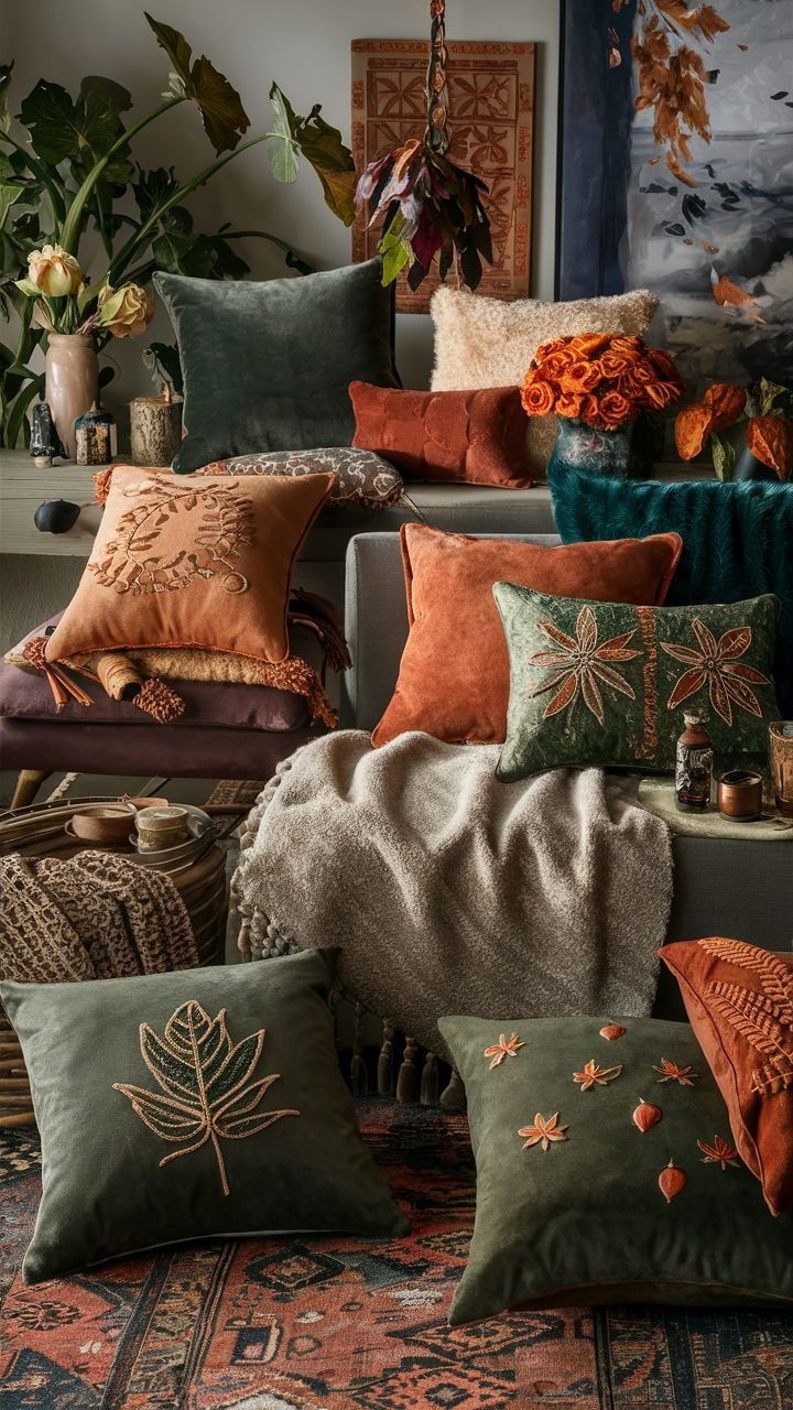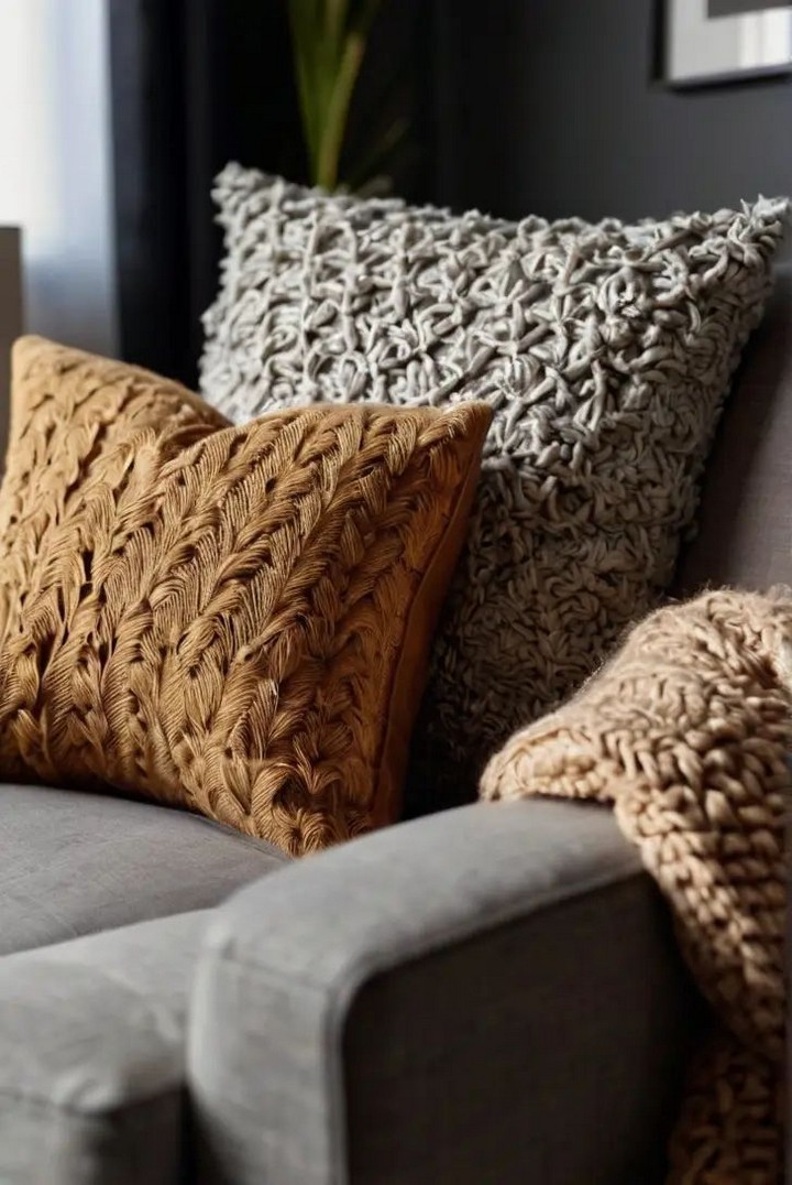 Layer different textures like chunky knit throws, smooth leather, nubby linen, and plush velvet to create a rich, tactile experience.