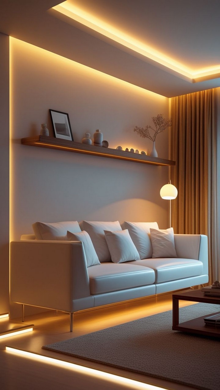 Install LED strips behind floating shelves, under cabinets, or behind the TV console for subtle accent lighting.