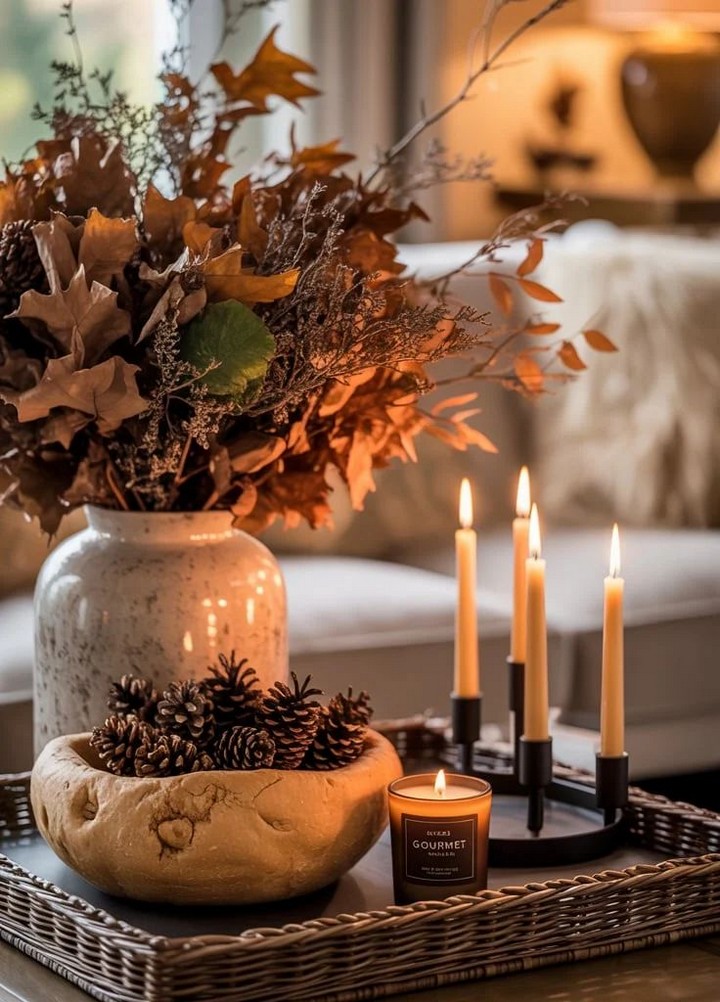 Create cozy ambiance with varied candle arrangements using pillar candles, votives, and LED candles in hurricane glasses.