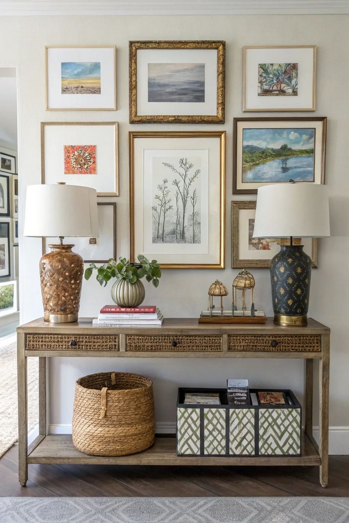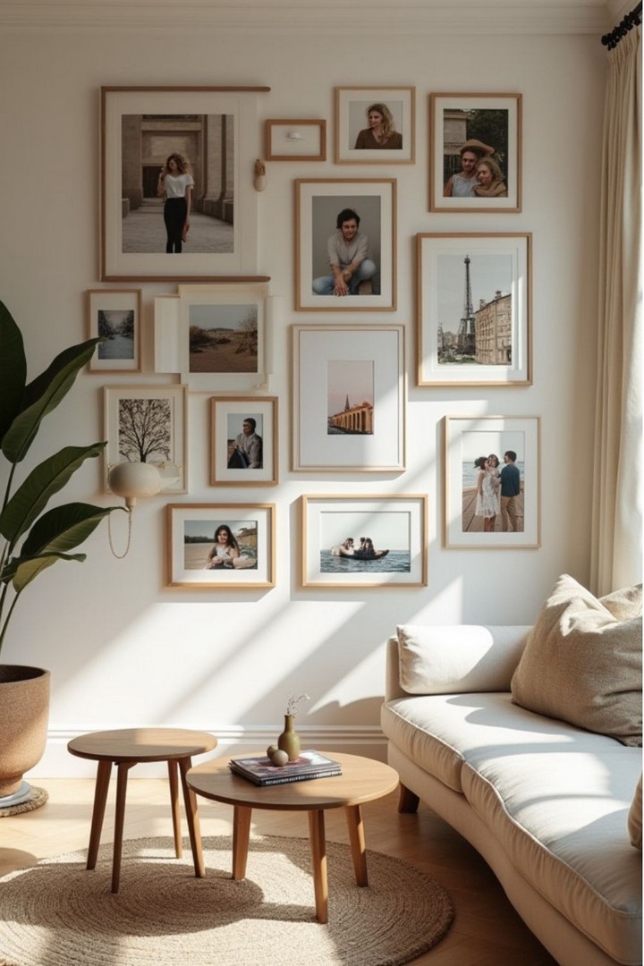 Mix modern art prints with personal photographs in coordinating frames for a gallery wall that feels both curated and personal.