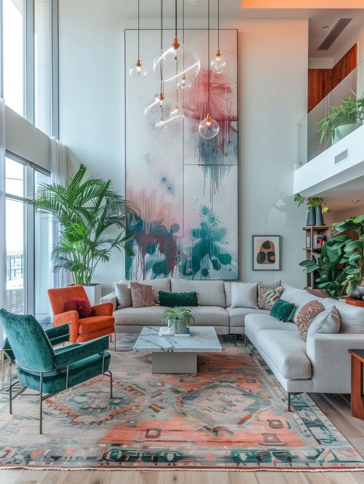 Invest in one or two large abstract pieces in warm tones that complement your color palette rather than multiple smaller pieces.