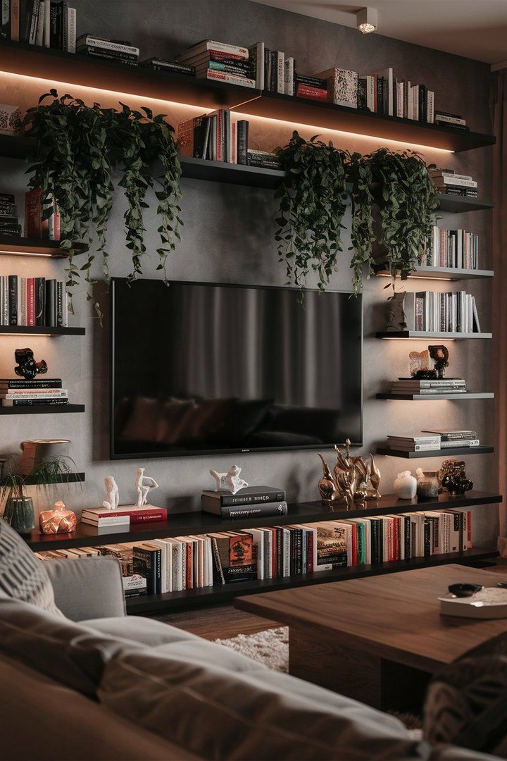 Install floating shelves to display a mix of books, plants, and decorative objects, creating visual interest without cluttering walls.