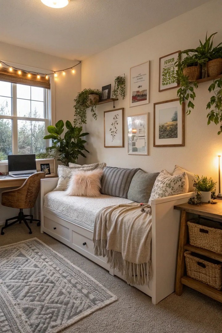 Start with sage green walls paired with cream-colored furniture for an instantly calming effect. This earthy palette creates a serene backdrop that feels both modern and timeless.